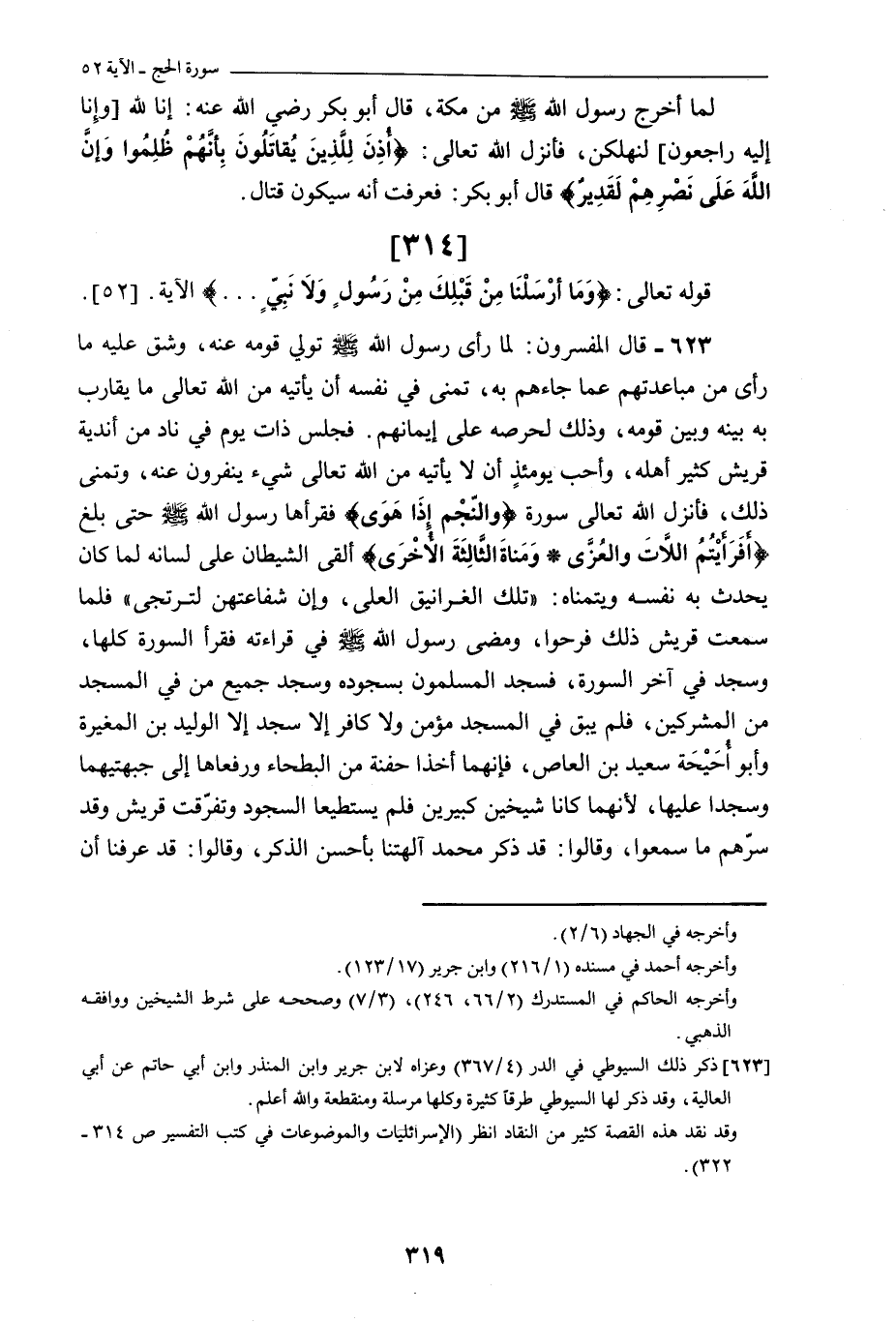 «623» - قَالَ الْمُفَسِّرُونَ: لَمَّا رَأَى رسول اللَّه صلى اللَّه عليه وسلم تَوَلِّيَ قَوْمِهِ عَنْهُ، وَشَقَّ عَلَيْهِ مَا رَأَى مِنْ مُبَاعَدَتِهِمْ عَمَّا جَاءَهُمْ بِهِ، تَمَنَّى فِي نَفْسِهِ أَنْ يَأْتِيَهُ مِنَ اللَّهِ تَعَالَى مَا يُقَارِبُ بِهِ بَيْنَهُ وَبَيْنَ قَوْمِهِ، وَذَلِكَ لِحِرْصِهِ عَلَى إِيمَانِهِمْ. فَجَلَسَ ذَاتَ يَوْمٍ فِي نَادٍ مِنْ أَنْدِيَةِ قُرَيْشٍ كَثِيرٍ أَهْلُهُ، وَأَحَبَّ يَوْمَئِذٍ أَنْ لَا يَأْتِيَهُ مِنَ اللَّهِ تَعَالَى شَيْءٌ يَنْفِرُونَ عَنْهُ، وَتَمَنَّى ذَلِكَ، فَأَنْزَلَ اللَّهُ تَعَالَى سُورَةَ وَالنَّجْمِ إِذَا هَوَى فَقَرَأَهَا رسول اللَّه صلى اللَّه عليه وسلم حَتَّى بَلَغَ أَفَرَأَيْتُمُ اللَّاتَ وَالْعُزَّى وَمَنَاةَ الثَّالِثَةَ الْأُخْرَى أَلْقَى الشَّيْطَانُ عَلَى لِسَانِهِ لِمَا كَانَ يُحَدِّثُ به نفسه ويتمناه: «تِلْكَ الْغَرَانِيقَ الْعُلَى، وَإِنَّ شَفَاعَتَهُنَّ لَتُرْتَجَى» فَلَمَّا سَمِعَتْ قُرَيْشٌ ذَلِكَ فَرِحُوا، وَمَضَى رسول اللَّه صلى اللَّه عليه وسلم فِي قِرَاءَتِهِ فَقَرَأَ السُّورَةَ كُلَّهَا، وَسَجَدَ فِي آخِرِ السُّورَةِ، فَسَجَدَ الْمُسْلِمُونَ بِسُجُودِهِ وَسَجَدَ جَمِيعُ مَنْ فِي الْمَسْجِدِ مِنَ الْمُشْرِكِينَ، فَلَمْ يَبْقَ فِي الْمَسْجِدِ مُؤْمِنٌ وَلَا كَافِرٌ إِلَّا سَجَدَ إِلَّا الْوَلِيدَ بن المغيرة وأبو أُحَيْحَةَ سَعِيدَ بْنَ الْعَاصِ، فَإِنَّهُمَا أَخَذَا حَفْنَةً مِنَ الْبَطْحَاءِ ورفعاها إلى جبهتيهما وَسَجَدَا عَلَيْهَا، لِأَنَّهُمَا كَانَا شَيْخَيْنِ كَبِيرَيْنِ فَلَمْ يَسْتَطِيعَا السُّجُودَ وَتَفَرَّقَتْ قُرَيْشٌ وَقَدْ سَرَّهُمْ مَا سَمِعُوا، وَقَالُوا: قَدْ ذَكَرَ مُحَمَّدٌ آلِهَتَنَا بأحسن الذكر، وقالوا: قَدْ عَرَفْنَا أَنَّ