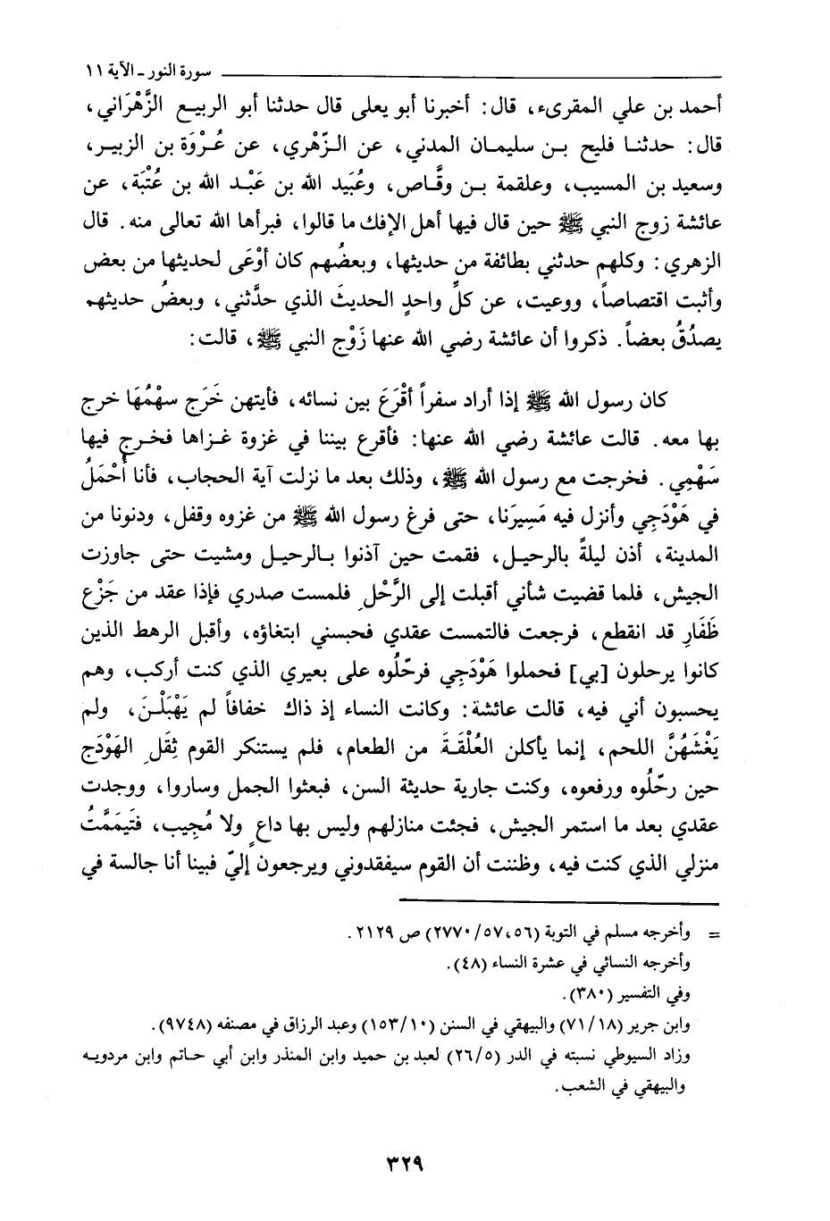 كَانَ رسول اللَّه صلى اللَّه عليه وسلم إِذَا أَرَادَ سَفَرًا أَقْرَعَ بَيْنَ نِسَائِهِ، فَأَيَّتُهُنَّ خَرَجَ سَهْمُهَا خَرَجَ بِهَا مَعَهُ. قَالَتْ عَائِشَةُ رَضِيَ اللَّهُ عَنْهَا: فَأَقْرَعَ بَيْنَنَا فِي غَزْوَةٍ غَزَاهَا فَخَرَجَ فِيهَا سَهْمِي. فَخَرَجْتُ مَعَ رسول اللَّه صلى اللَّه عليه وسلم، وَذَلِكَ بَعْدَ مَا نَزَلَتْ آيَةُ الْحِجَابِ، فَأَنَا أُحْمَلُ فِي هَوْدَجِي وَأَنْزِلُ فِيهِ مَسِيرَنَا، حَتَّى فَرَغَ رسول اللَّه صلى اللَّه عليه وسلم مِنْ غَزْوِهِ وَقَفَلَ، وَدَنَوْنَا مِنَ الْمَدِينَةِ، أُذِنَ لَيْلَةً بِالرَّحِيلِ، فَقُمْتُ حِينَ آذَنُوا بِالرَّحِيلِ وَمَشَيْتُ حَتَّى جَاوَزْتُ الْجَيْشَ، فَلَمَّا قَضَيْتُ شَأْنِي أَقْبَلْتُ إِلَى الرَّحْلِ فَلَمَسْتُ صَدْرِي فَإِذَا عِقْدٌ مِنْ جَزْعِ ظَفَارِ قَدِ انْقَطَعَ، فَرَجَعْتُ فَالْتَمَسْتُ عِقْدِي فَحَبَسَنِي ابْتِغَاؤُهُ، وأقبل الرهط الذين كَانُوا يَرْحَلُونَ [بِي] فَحَمَلُوا هَوْدَجِي فَرَحَّلُوهُ عَلَى بَعِيرِي الَّذِي كُنْتُ أَرْكَبُ، وَهُمْ يَحْسَبُونَ أَنِّي فِيهِ، قَالَتْ عَائِشَةُ: وَكَانَتِ النِّسَاءُ إِذْ ذَاكَ خِفَافًا لَمْ يُهْبَلْنَ، وَلَمْ يَغْشَهُنَّ اللَّحْمُ، إِنَّمَا يَأْكُلْنَ الْعُلْقَةَ مِنَ الطَّعَامِ، فَلَمْ يَسْتَنْكِرِ الْقَوْمُ ثِقَلَ الْهَوْدَجِ حِينَ رَحَّلُوهُ وَرَفَعُوهُ، وَكُنْتُ جَارِيَةً حَدِيثَةَ السِّنِّ، فَبَعَثُوا الْجَمَلَ وَسَارُوا، ووجدت عقدي بعد ما اسْتَمَرَّ الْجَيْشُ، فَجِئْتُ مَنَازِلَهُمْ وَلَيْسَ بِهَا دَاعٍ وَلَا مُجِيبٌ، فَتَيَمَّمْتُ مَنْزِلِي الَّذِي كُنْتُ فِيهِ، وَظَنَنْتُ أَنَّ القوم سيفقدوني ويرجعون إليّ فبينا أَنَا جَالِسَةٌ فِي
