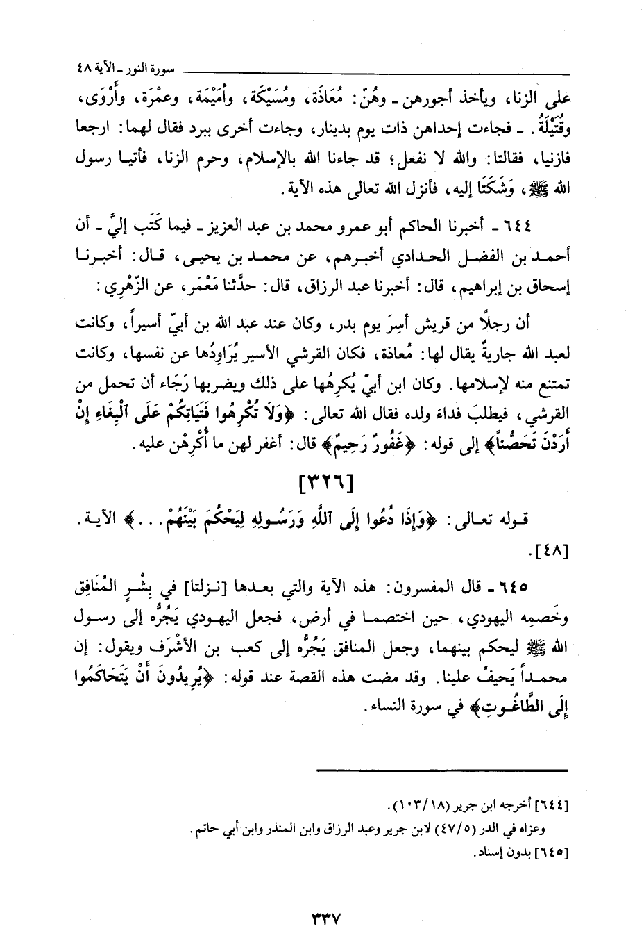 عَلَى الزِّنَا، وَيَأْخُذُ أُجُورَهُنَّ- وَهُنَّ: مُعَاذَةُ، وَمُسَيْكَةُ، وَأُمَيْمَةُ، وَعَمْرَةُ، وَأَرْوَى، وَقُتَيْلَةُ. - فَجَاءَتْ إِحْدَاهُنَّ ذَاتَ يَوْمٍ بِدِينَارٍ، وَجَاءَتْ أُخْرَى بِبُرْدٍ فَقَالَ لَهُمَا: ارْجِعَا فَازْنِيَا، فَقَالَتَا: وَاللَّهِ لَا نَفْعَلُ، قَدْ جَاءَنَا اللَّهُ بِالْإِسْلَامِ، وَحَرَّمَ الزِّنَا، فَأَتَيَا رسول اللَّه صلى اللَّه عليه وسلم، وَشَكَتَا إِلَيْهِ، فَأَنْزَلَ اللَّهُ تَعَالَى هَذِهِ الْآيَةَ.