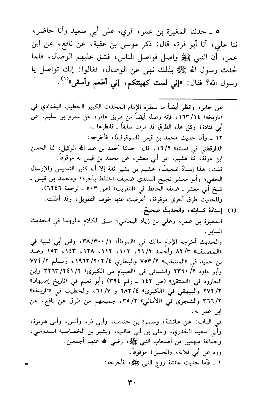 5 - حَدثنَا الْمُغيرَة بن عمر قريء على أبي سعيد وأناحاضر ثَنَا عَليّ أَنا أبوقرة قَالَ ذَكَرَ مُوسَى بْنُ عُقْبَةَ عَنْ نَافِعٍ عَنِ ابْنِ عُمَرَ أَنَّ النَّبِيَّ صَلَّى اللَّهُ عَلَيْهِ وَسَلَّمَ وَاصَلَ فَوَاصَلَ النَّاسُ فَشَقَّ عَلَيْهِمُ الْوِصَالُ فَلَمَّا حُدِّثَ رَسُولُ اللَّهِ صَلَّى اللَّهُ عَلَيْهِ وَسَلَّمَ بِذَلِكَ نَهَى عَنِ الْوِصَالِ فَقَالُوا إِنَّكَ