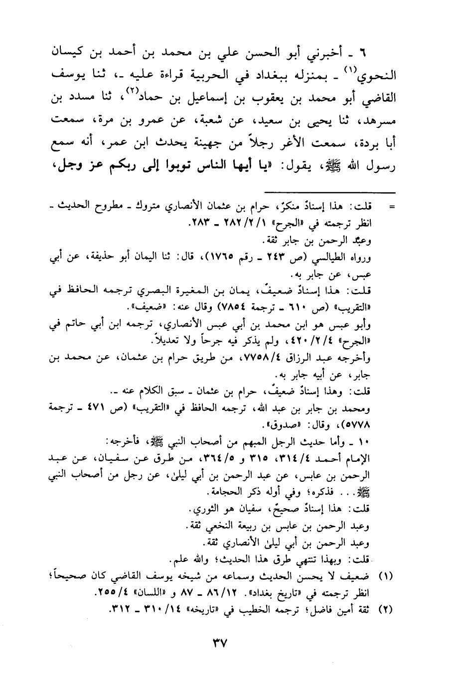 6 - أَخْبَرَنِي أَبُو الْحَسَنِ عَلِيُّ بْنُ مُحَمَّدِ بْنِ أَحْمَدَ بْنِ كَيْسَانَ النَّحْوِيُّ بِمَنْزِلِهِ بِبَغْدَادَ فِي الْحَرْبِيَّةِ قِرَاءَةً عَلَيْهِ ثَنَا يُوسُفُ الْقَاضِي أَبُو مُحَمَّدِ بْنُ يَعْقُوبَ بْنِ إِسْمَاعِيلَ بْنِ حَمَّادٍ ثَنَا مُسَدَّدُ بْنُ مُسَرْهَدٍ ثَنَا يَحْيَى بْنُ سَعِيدٍ عَنْ شُعْبَةَ عَنْ عَمْرِو بْنِ مُرَّةَ سَمِعْتُ أَبَا بَرْدَةَ سَمِعْتُ الْأَغَرَّ رَجُلًا مِنْ جُهَيْنَةَ يُحَدِّثُ ابْنَ عُمَرَ أَنَّهُ سَمِعَ رَسُول الله (ص) يَقُولُ يَا أَيُّهَا النَّاسُ تُوبُوا إِلَى ربكُم عز وجلّ فَإِنِّي أَتُوبُ إِلَى اللَّهِ كُلَّ يَوْم مائَة مرّة اسناده ضَعِيف والْحَدِيث حسن