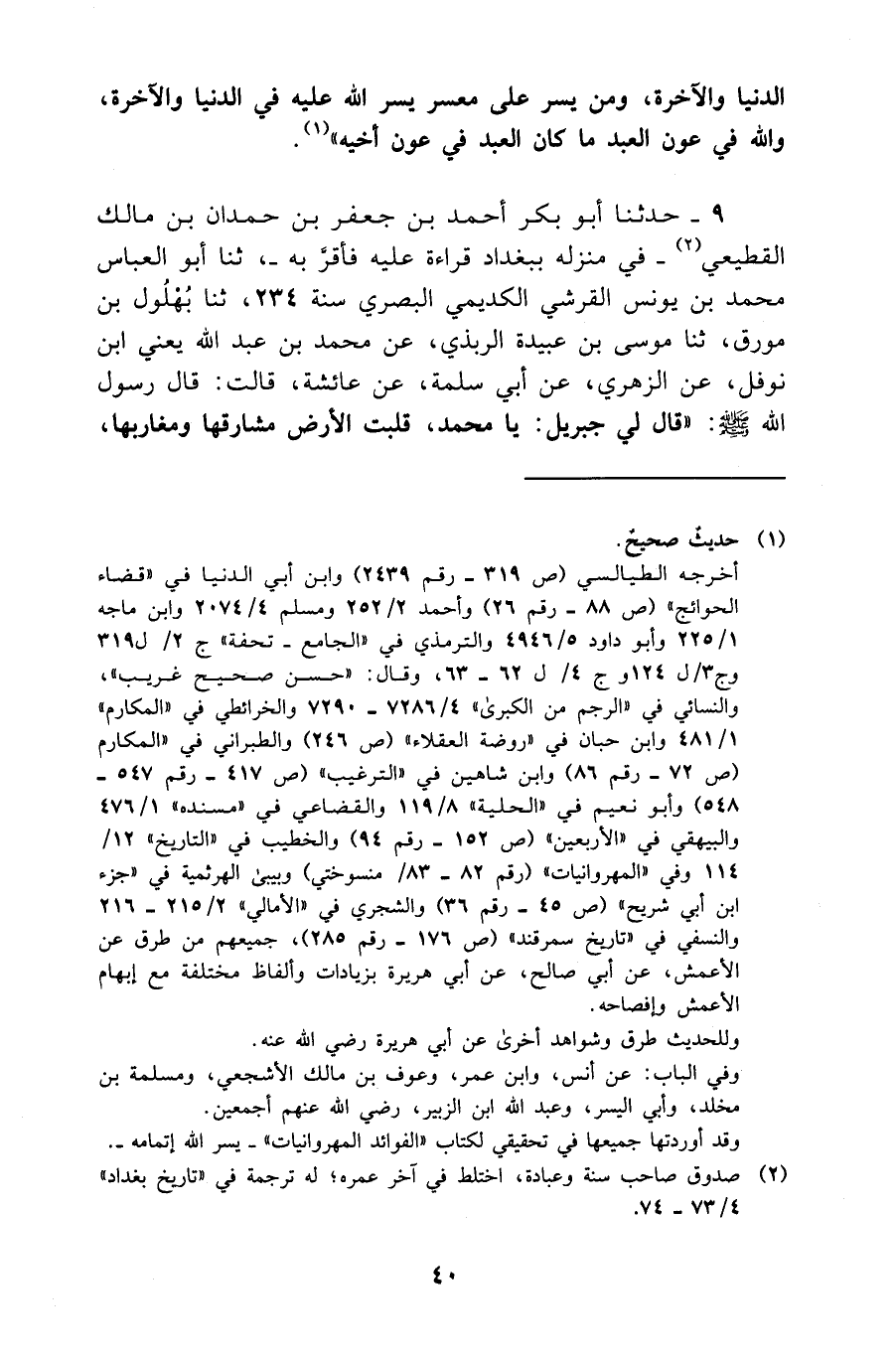 9 - حَدَّثَنَا أَبُو بَكْرٍ أَحْمَدُ بْنُ جَعْفَرِ بْنِ حَمْدَانَ بْنِ مَالِكٍ الْقَطِيعِيُّ فِي مَنْزِلِهِ بِبَغْدَادَ قِرَاءَةً عَلَيْهِ فَأَقَرَّ بِهِ ثَنَا أَبُو الْعَبَّاسِ مُحَمَّدُ بْنُ يُونُسَ الْقُرَشِيُّ الْكَدِيمِيُّ الْبَصْرِيُّ سَنَةَ 234 ثَنَا بُهْلُولُ بْنُ مُوَرِّقٍ ثَنَا مُوسَى بْنُ عُبَيْدَةَ الرَّبَذِيُّ عَنْ مُحَمَّدِ بْنِ عَبْدِ اللَّهِ يَعْنِي ابْنَ نَوْفَلٍ عَنِ الزُّهْرِيِّ عَنْ أَبِي سَلَمَةَ عَنْ عَائِشَةَ قَالَتْ قَالَ رَسُولُ اللَّهِ صَلَّى اللَّهُ عَلَيْهِ وَسَلَّمَ