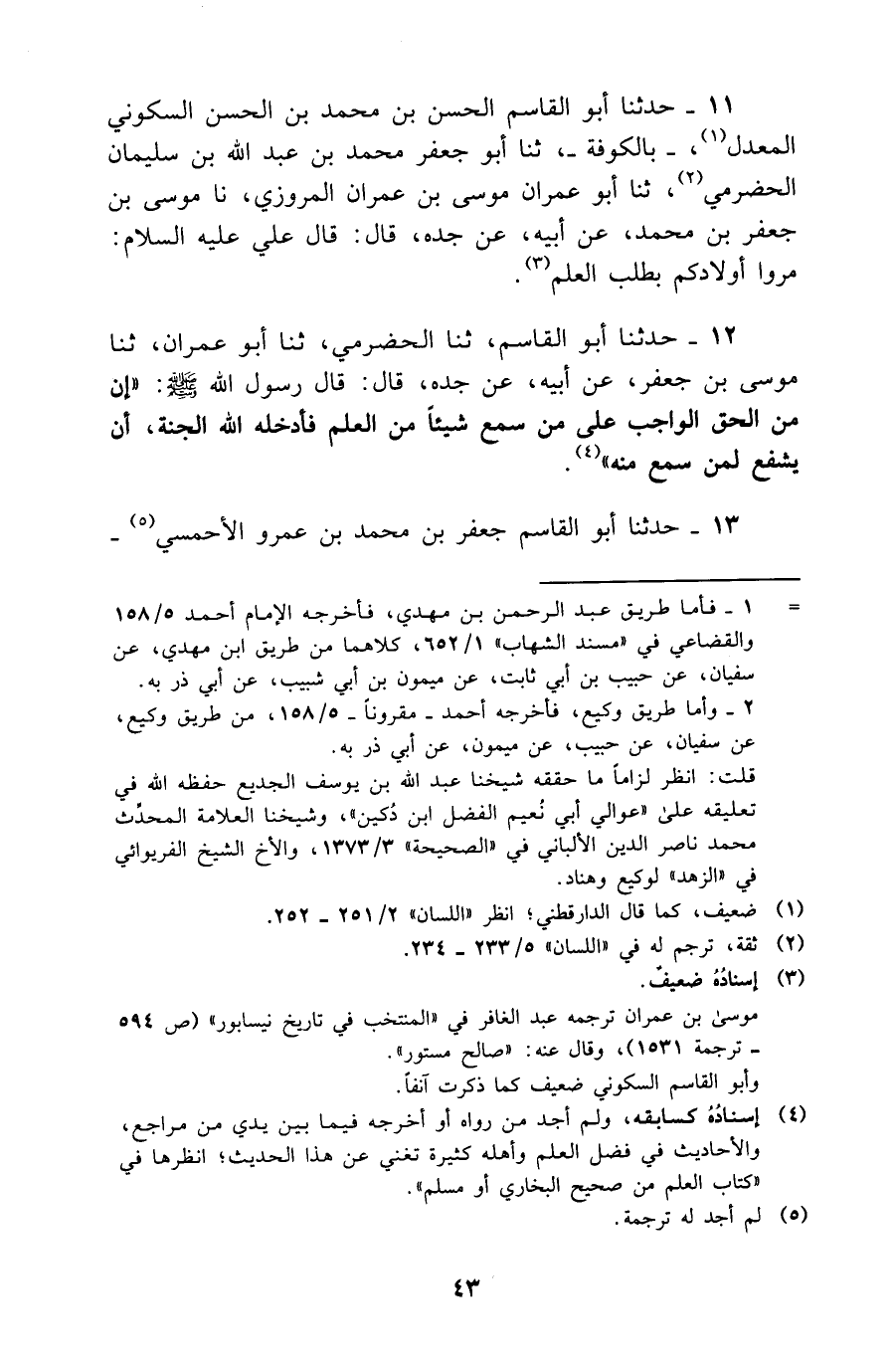 11 - حَدَّثَنَا أَبُو الْقَاسِمِ الْحَسَنُ بْنُ مُحَمَّدِ بْنِ الْحَسَنِ السَّكُونِيُّ الْمُعَدَّلُ بِالْكُوفَةِ ثَنَا أَبُو جَعْفَرٍ مُحَمَّدُ بْنُ عَبْدِ اللَّهِ بْنِ سُلَيْمَانَ الْحَضْرَمِيُّ ثَنَا أَبُو عِمْرَانَ مُوسَى بْنُ عِمْرَانَ الْمَرْوَزِيُّ نَا مُوسَى بْنُ جَعْفَرِ بْنِ مُحَمَّدٍ عَنْ أَبِيهِ عَنْ جَدِّهِ قَالَ قَالَ عَلِيٌّ عَلَيْهِ السَّلَامُ مُرُوا أَوْلَادَكُمْ بِطَلَب الْعلم اسناده ضَعِيف