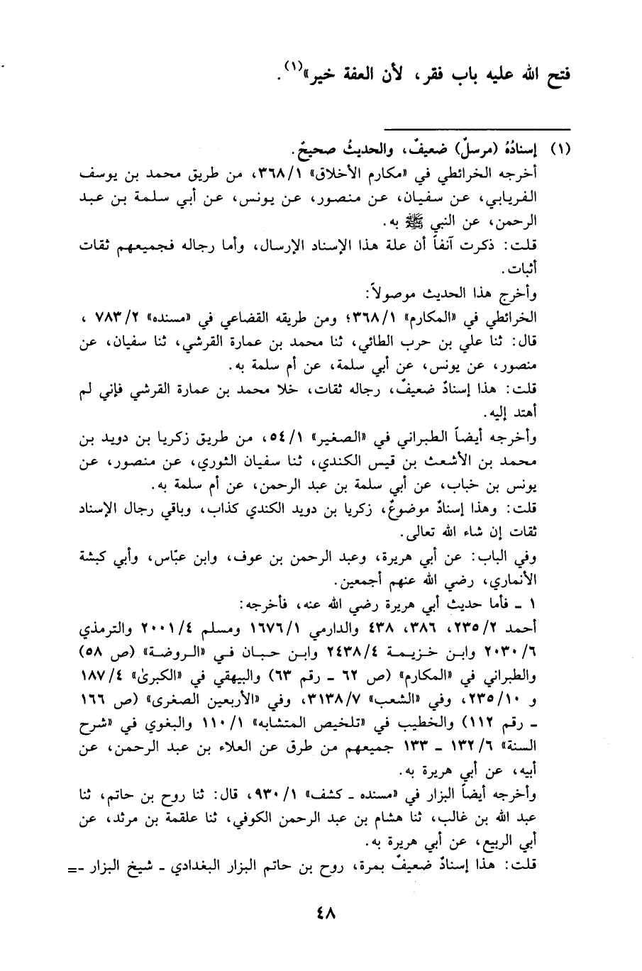 فتح الله عَلَيْهِ با بفقر لِأَن الْعِفَّة خير اسناده مُرْسل ضَعِيف والْحَدِيث صَحِيح