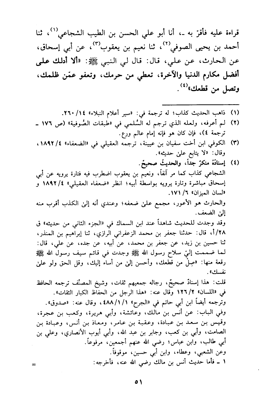 أَلَا أَدُلُّكَ عَلَى أَفْضَلِ مَكَارِمَ الدُّنْيَا وَالْآخِرَةِ تُعْطِي مَنْ حَرَمَكَ وَتَعْفُو عَمَّنْ ظَلَمَكَ وَتَصِلُ مَنْ قَطعك اسناده مُنكر جدا والْحَدِيث