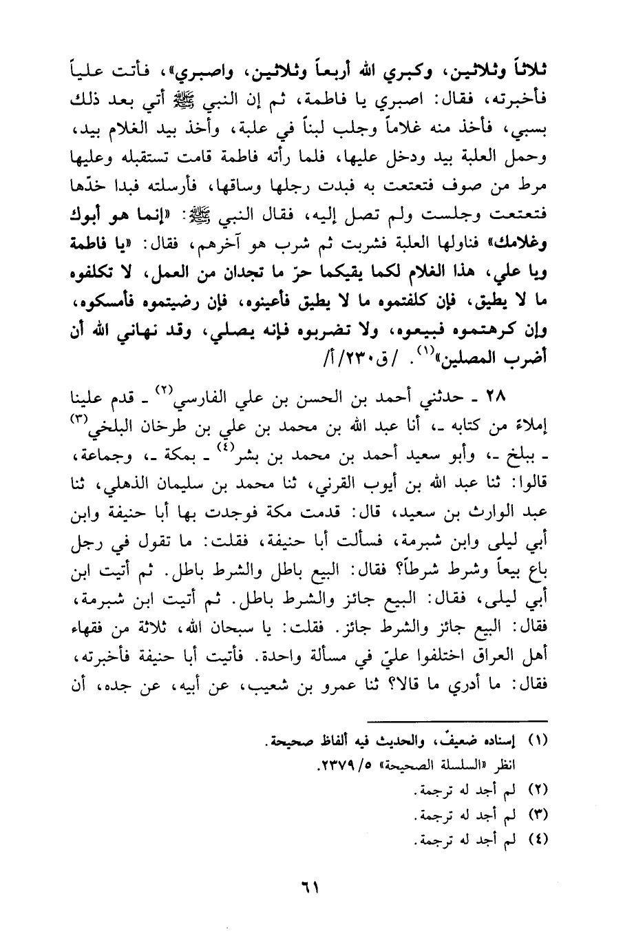 28 - حَدَّثَنِي أَحْمَدُ بْنُ الْحَسَنِ بْنِ عَلِيٍّ الْفَارِسِيُّ قَدَّمَ عَلَيْنَا إِمْلَاءً مِنْ كِتَابِهِ أَنَا عَبْدُ اللَّهِ بْنُ مُحَمَّدِ بْنِ عَلِيِّ بْنِ طَرْخَانَ الْبَلْخِيُّ بِبَلْخٍ وَأَبُو سَعِيدِ أَحْمَدُ بْنُ مُحَمَّدِ بْنِ بِشْرٍ بِمَكَّةَ وَجَمَاعَةٌ قَالُوا ثَنَا عَبْدُ اللَّهِ بْنُ أَيُوبَ الْقَرْنِيُّ ثَنَا مُحَمَّدُ بْنُ سُلَيْمَانَ الذَّهْلِيُّ ثَنَا عَبْدُ الْوَارِثِ بْنُ سَعِيدٍ قَالَ قَدِمْتُ مَكَّةَ فَوَجَدْتُ بِهَا أَبَا حَنِيفَةَ وَابْنَ أَبِي لَيْلَى وَابْنَ شُبْرُمَةَ فَسَأَلْتُ أَبَا حَنِيفَةَ فَقُلْتُ مَا تَقُولُ فِي رَجِلٍ بَاعَ بَيْعًا وَشَرَطَ شَرْطًا فَقَالَ الْبَيْعُ بَاطِلٌ وَالشَّرْطُ بَاطِلٌ ثُمَّ أَتَيْتُ ابْنَ أَبِي لَيْلَى فَقَالَ الْبَيْعُ جَائِزٌ وَالشَّرْطُ بَاطِلٌ ثُمَّ أَتَيْتُ ابْنَ شُبْرُمَةَ فَقَالَ الْبَيْعُ جَائِزٌ وَالشَّرْطُ جَائِزٌ فَقُلْتُ يَا سُبْحَانَ الله ثَلَاثَة فُقَهَاءِ أَهْلِ الْعِرَاقِ اخْتَلَفُوا عَلَيَّ فِي مَسْأَلَةٍ وَاحِدَةٍ فَأَتَيْتُ أَبَا حَنِيفَةَ فَأَخْبَرْتُهُ فَقَالَ مَا أَدْرِي مَا قَالَا ثَنَا عَمْرُو بْنُ شُعَيْب عَن ابيه عَن حَده أَنَّ