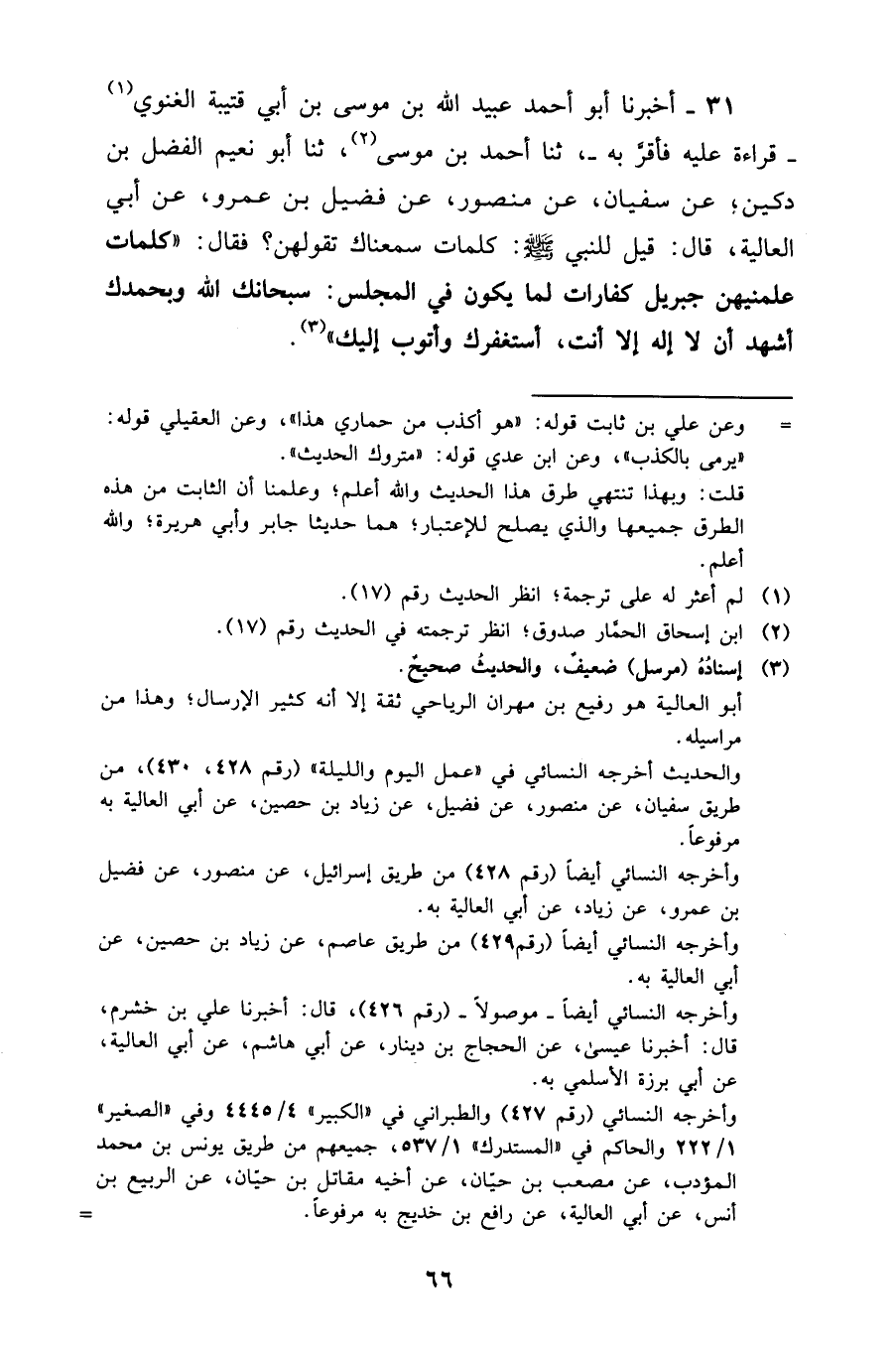 31 - أَخْبَرَنَا أَبُو أَحْمَدَ عُبَيْدُ اللَّهِ بْنُ مُوسَى بْنِ أَبِي قُتَيْبَةَ الْغَنَوِيُّ قِرَاءَةً عَلَيْهِ فَأَقَرَّ بِهِ ثَنَا أَحْمَدُ بْنُ مُوسَى ثَنَا أَبُو نُعَيْمٍ الْفَضْلُ بْنُ دُكَيْنٍ عَنْ سُفْيَانَ عَنْ مَنْصُورٍ عَنْ فُضَيْلِ بْنِ عَمْرٍو عَنْ أَبِي الْعَالِيَةِ قَالَ قِيلَ لِلنَّبِيِّ صَلَّى اللَّهُ عَلَيْهِ وَسَلَّمَ كَلِمَاتٌ سَمِعْنَاكَ تَقُولُهُنَّ فَقَالَ