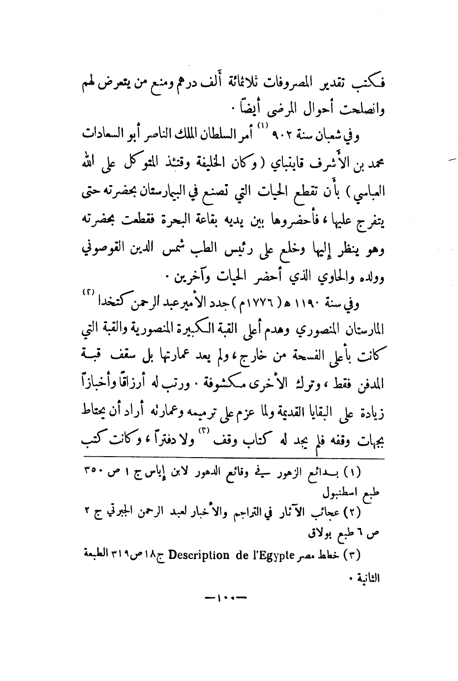 وفي سنة 1190هـ 1776م جدد الأمير عبد الرحمن كتخذا المارستان المنصوري وهدم أعلى القبة الكبيرة المنصورية والقبة التي كانت بأعلى الفسحة من خارج، ولم يعد عمارتها بل سقف قبة المدفن فقط، وترك الأخرى مكشوفة. ورتب له أرزاقا وأخبازا زيادة على البقايا القديمة ولما عزم على ترميمه وعمارته أراد أن يحتاط بجهات وقفه فلم يجد له كتاب وقف ولا دفترا، وكانت كتب