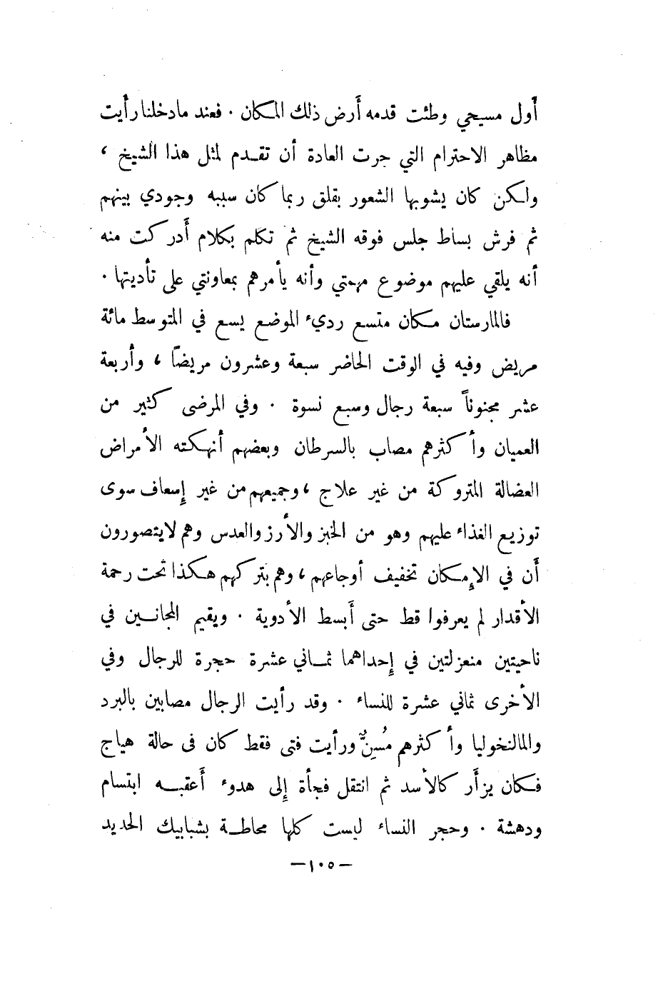 فالمارستان مكان متسع رديء الموضع يسع في المتوسط مائة مريض وفيه في الوقت الحاضر سبعة وعشرون مريضا، وأربعة عشر مجنونا سبعة رجال وسبع نسوة. وفي المرضى كثير من العميان وأكثرهم مصاب بالسرطان وبعضهم أنهكته الأمراض العضالة المتروكة من غير علاج، وجميعهم من غير إسعاف سوى توزيع الغذاء عليهم وهو من الخبز والأرز والعدس وهم لا يتصورون أن في الإمكان تخفيف أوجاعهم، وهم بتركهم هكذا تحت رحمة الأقدار لم يعرفوا قط حتى أبسط الأدوية. ويقيم المجانين في ناحيتين منعزلتين في إحداهما ثماني عشرة حجرة للرجال وفي الأخرى ثماني عشرة للنساء. وقد رأيت الرجال مصابين بالبرد والمالنخوليا وأكثرهم مسنٌّ ورأيت فتى فقط كان في حالة هياج فكان يزأر كالأسد ثم انتقل فجأة إلى هدوء أعقبه ابتسام ودهشة. وحجر النساء ليست كلها محاطة بشبابيك الحديد