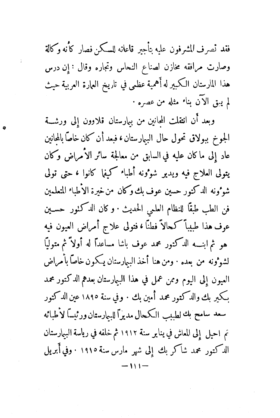 كانوا، حتى تولى شؤونه الدكتور حسين عوف بك وكان من خيرة الأطباء المتعلمين فن الطب طبقا للنظام العلمي الحديث. وكان الدكتور حسين عوف هذا طبيبا كحالا فطنا، فتولى علاج أمراض العيون فيه هو ثم ابنه الدكتور محمد عوف باشا مساعدا له أولا ثم متوليا لشؤونه من بعده. ومن هنا أخذ البيمارستان يكون خاصا بأمراض العيون إلى اليوم وممن عمل في هذا البيمارستان بعدهم الدكتور محمد بكير بك والدكتور محمد أمين بك. وفي سنة 1895 عين الدكتور سعد سامح بك الطبيب الكحال مديرا للبيمارستان ورئيسا لأطبائه ثم أحيل إلى المعاش في يناير سنة 1912 ثم خلفه في رياسة البيمارستان الدكتور محمد شاكر بك إلى شهر مارس سنة 1915. وفي أبريل