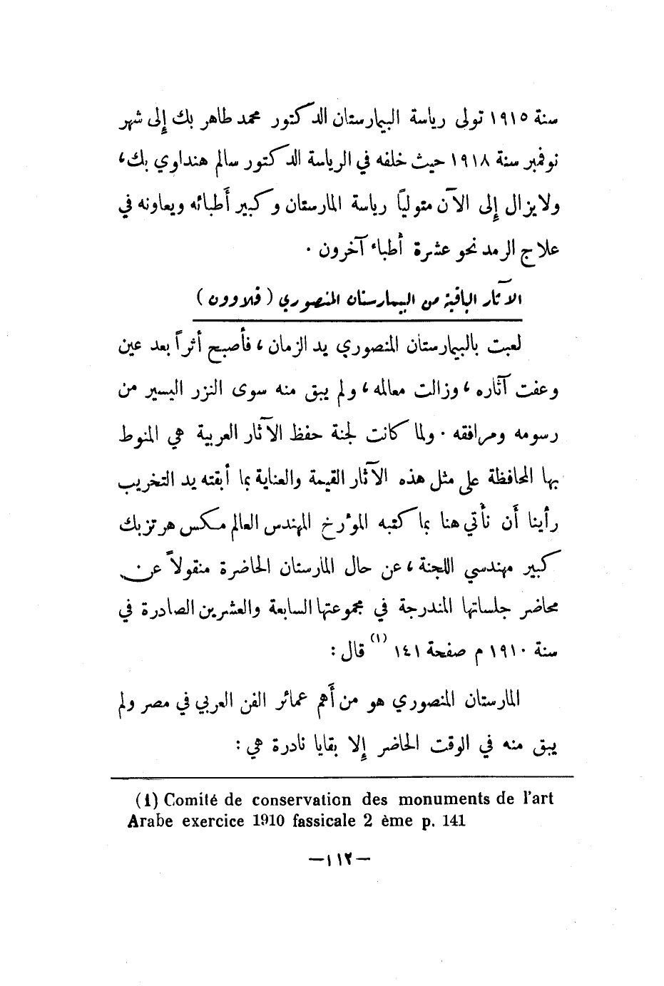 سنة 1915 تولى رياسة البيمارستان الدكتور محمد طاهر بك إلى شهر نوفمبر سنة 1918 حيث خلفه في الرياسة الدكتور سالم هنداوي بك، ولا يزال إلى الآن متوليا رياسة المارستان وكبير أطبائه ويعاونه في علاج الرمد نحو عشرة أطباء آخرون.