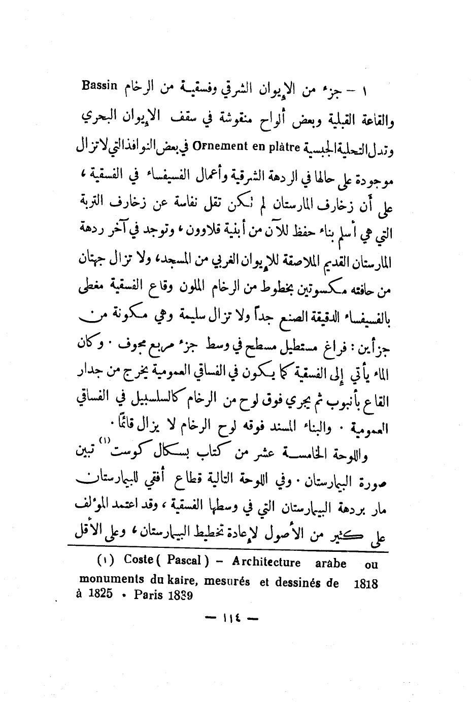 واللوحة الخامسة عشر من كتاب بسكال كوست تبين صورة البيمارستان. وفي اللوحة التالية قطاع أفقي للبيمارستان مار بردهة البيمارستان التي في وسطها الفسقية، وقد اعتمد المؤلف على كثير من الأصول لإعادة تخطيط البيمارستان، وعلى الأقل