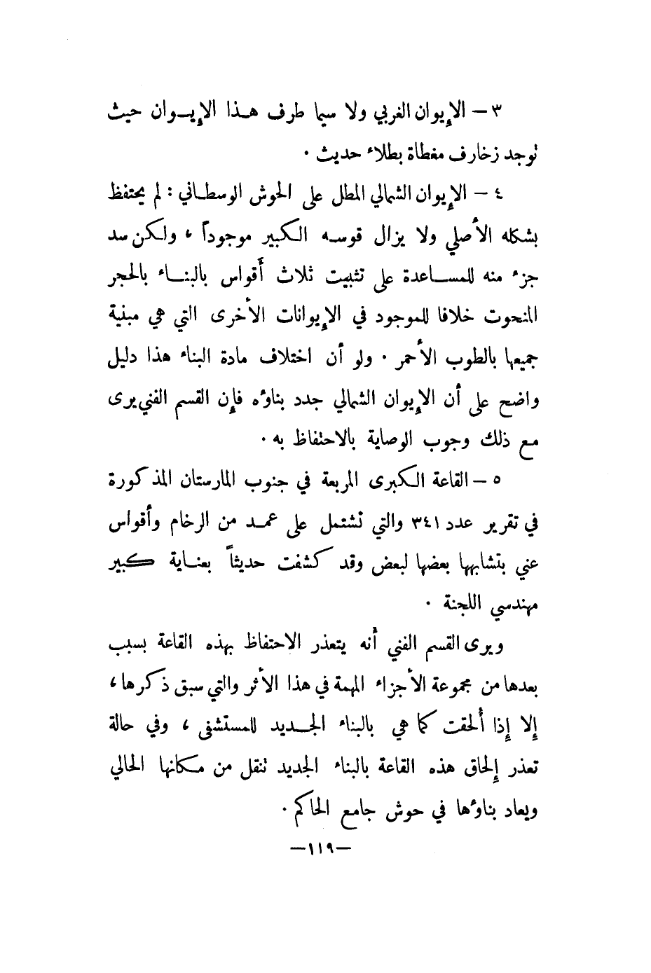 5 - القاعة الكبرى المربعة في جنوب المارستان المذكورة في تقرير عدد 341 والتي تشتمل على عمد من الرخام وأقواس عني بتشابهها بعضها لبعض وقد كشفت حديثا بعناية كبير مهندسي اللجنة.
