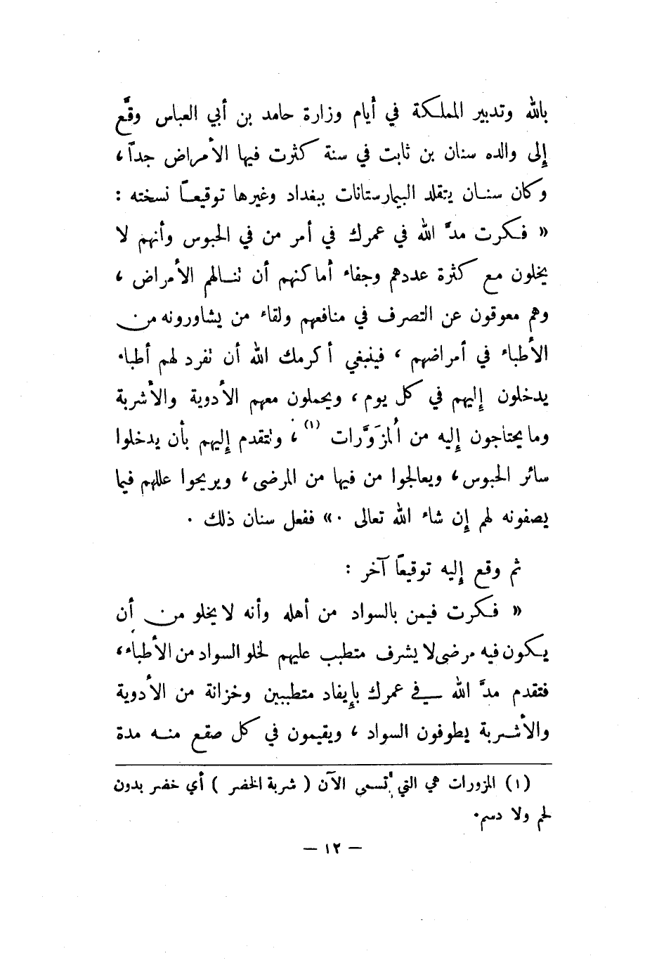 بالله وتدبير المملكة في أيام وزارة حامد بن أبي العباس وقع إلى والده سنان بن ثابت في سنة كثرت فيها الأمراض جدا، وكان سنان يتقلد البيمارستانات ببغداد وغيرها توقيعا نسخته: فكرت مدَّ الله في عمرك في أمر من في الحبوس وأنهم لا يخلون مع كثرة عددهم وجفاء أماكنهم أن تنالهم الأمراض، وهم معوقون عن التصرف في منافعهم ولقاء من يشاورونه من الأطباء في أمراضهم، فينبغي أكرمك الله أن تفرد لهم أطباء يدخلون إليهم في كل يوم، ويحملون معهم الأدوية والأشربة وما يحتاجون إليه من المزوَّرات، وتتقدم إليهم بأن يدخلوا سائر الحبوس، ويعالجوا من فيها من المرضى، ويريحوا عللهم