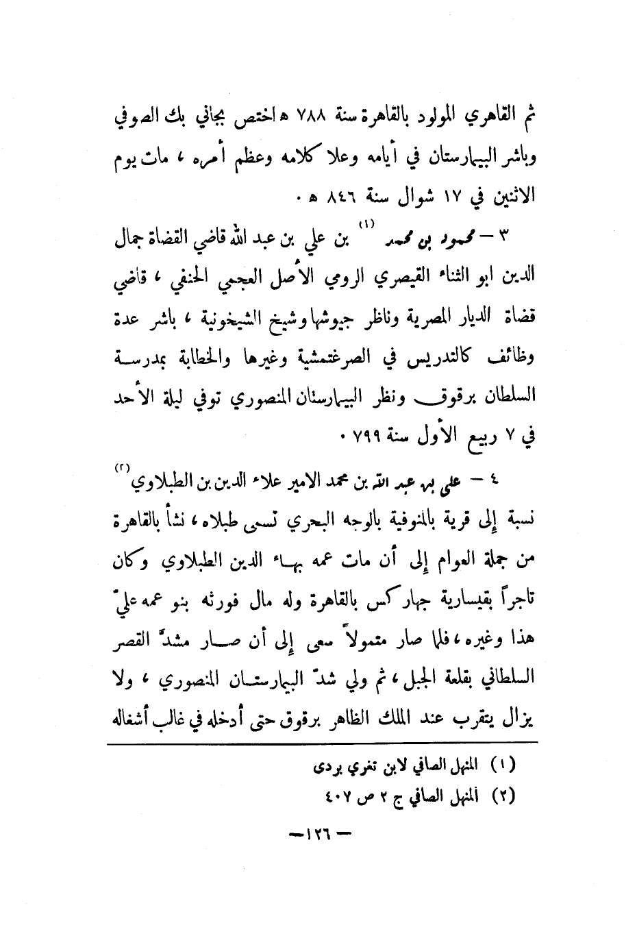 3 - محمود بن محمد بن علي بن عبد الله قاضي القضاة جمال الدين أبو الثناء القيصري الرومي الأصل العجمي الحنفي، قاضي قضاة الديار المصرية وناظر جيوشها وشيخ الشيخونية، باشر عدة وظائف كالتدريس في الصرغتمشية وغيرها والخطابة بمدرسة السلطان برقوق ونظر البيمارستان المنصوري توفي ليلة الأحد في 7ربيع الأول سنة 799.