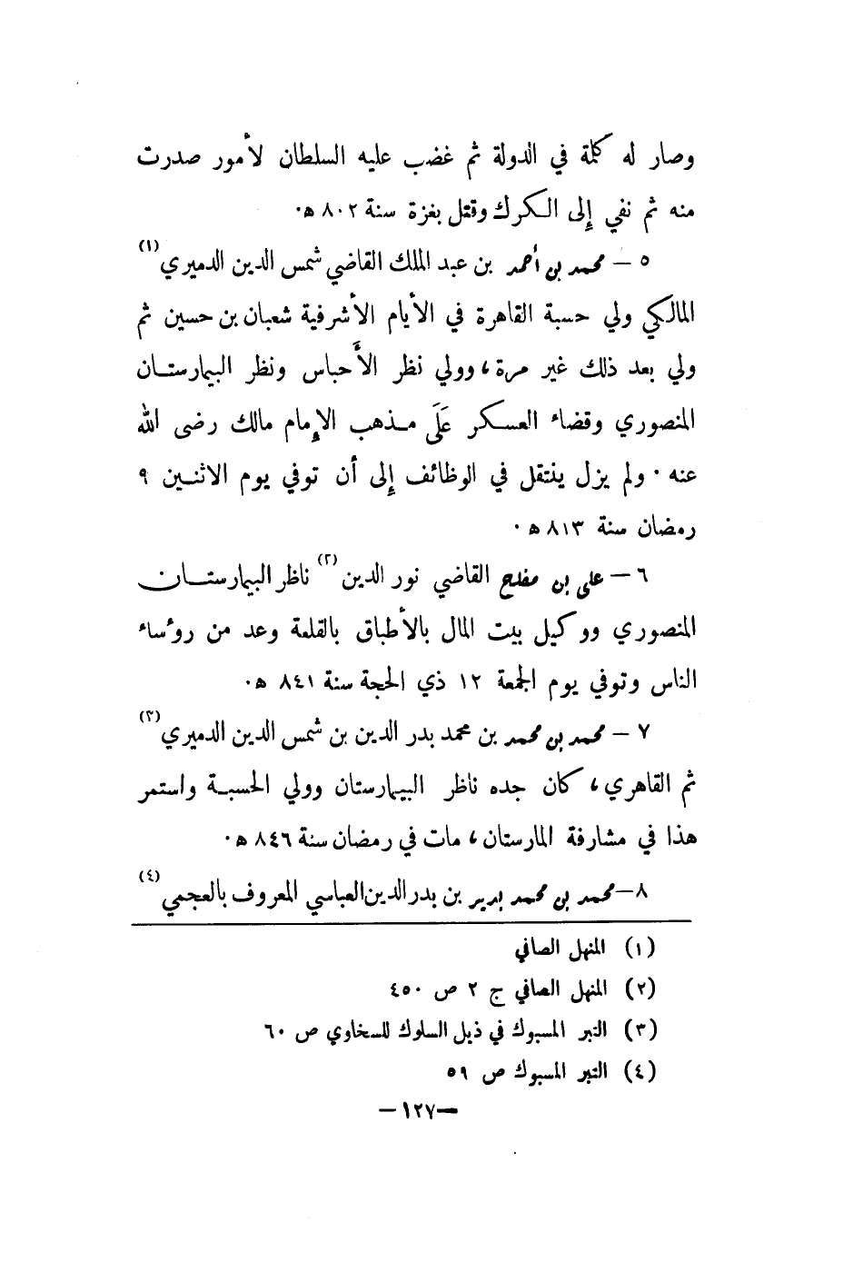 5 - محمد بن أحمد بن عبد الملك القاضي شمس الدين الدميري المالكي ولي حسبة القاهرة في الأيام الأشرفية شعبان بن حسين ثم ولي بعد ذلك غير مرة، وولي نظر الأحباس ونظر البيمارستان المنصوري وقضاء العسكر على مذهب الإمام مالك رضى الله عنه. ولم يزل ينتقل في الوظائف إلى أن توفي يوم الاثنين