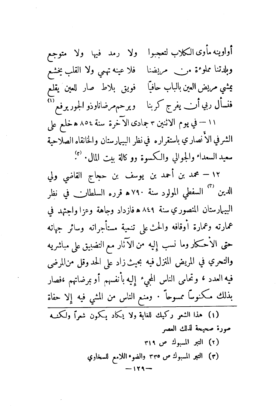 12 - محمد بن أحمد بن يوسف بن حجاج القاضي ولي الدين السفطي المولود سنة 790هـ قرره السلطان في نظر البيمارستان المنصوري سنة 849هـ فازداد وجاهة وعزا واجتهد في عمارته وعمارة أوقافه والحث على تنمية مستأجراته وسائر جهاته حتى الأحكار وما نسب إليه من الآثار مع التضييق على مباشرته والتحري في المريض المنزل فيه بحيث زاد على الحد وقل من المرضى فيه العدد، وتحامى الناس المجيء إليه بأنفسهم أو بمرضاتهم، فصار بذلك مكنوسا ممسوحا. ومنع الناس من المشي فيه إلا حفاة
