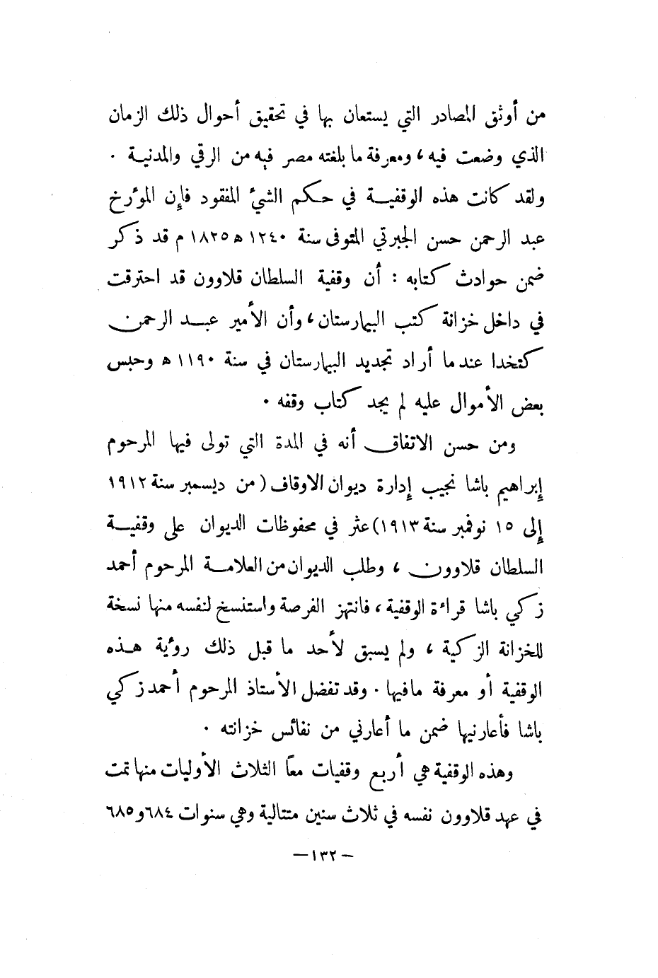 ومن حسن الاتفاق أنه في المدة التي تولى فيها المرحوم إبراهيم باشا نجيب إدارة ديوان الأوقاف من ديسمبر سنة 1912 إلى 15نوفمبر سنة 1913 عثر في محفوظات الديوان على وقفية السلطان قلاوون، وطلب الديوان من العلامة المرحوم أحمد زكي باشا قراءة الوقفية، فانتهز الفرصة واستنسخ لنفسه منها نسخة للخزانة الزكية، ولم يسبق لأحد ما قبل ذلك رؤية هذه الوقفية أو معرفة ما فيها. وقد تفضل الأستاذ المرحوم أحمد زكي باشا فأعارنيها ضمن ما أعارني من نفائس خزانته.