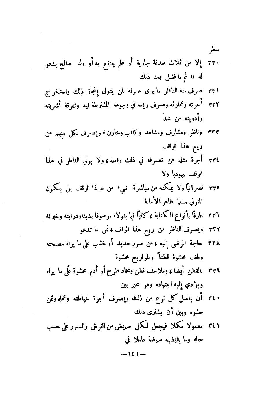 بدينه ودرايته وخبرته ويصرف الناظر من ريع هذا الوقف، ثمن ما تدعوا حاجة المرضى إليه، من سرر حديد أو خشب على ما يراه مصلحته ولحف محشوة قطنا وطواريح محشوة بالقطن أيضا، وملاحف قطن ومخاد طرح أو أدم محشوة على ما يراه ويؤدي إليه اجتهاده وهو مخير بين أن يفصل كل نوع من ذلك ويصرف أجرة خياطته وعمله وثمن حشوه وبين أن يشتري ذلك معمولا مكملا فيجعل لكل مريض من الفرش على حسب حاله وما يقتضيه مرضه عاملا في