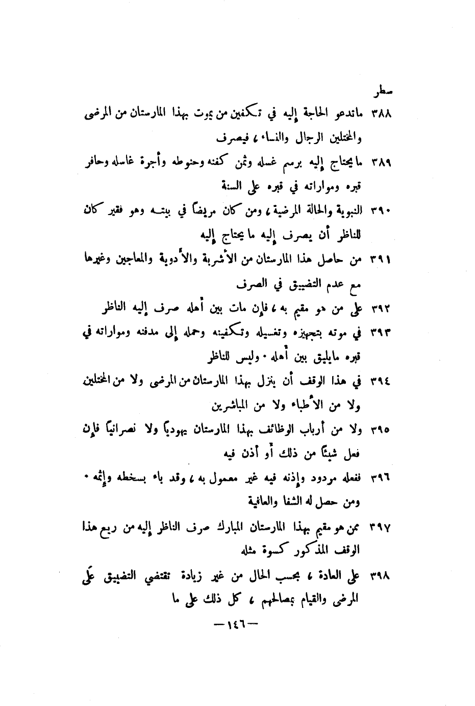 ما تدعوا الحاجة إليه في تكفين من يموت بهذا المارستان من المرضى والمختلين الرجال والنساء، فيصرف ما يحتاج إليه برسم غسله وثمن كفنه وحنوطه وأجرة غاسله وحافر قبره ومواراته في قبره على السنة النبوية والحالة المرضية، ومن كان مريضا في بيته وهو فقير كان للناظر أن يصرف إليه ما يحتاج إليه من حاصل هذا المارستان من الأشربة والأدوية والمعالجين وغيرها من عدم التضييق في الصرف على من هو مقيم به، فإن مات بين أهله صرف إليه الناظر في موته بتجهيزه وتغسيله وتكفينه وحمله إلى مدفنه ومواراته في قبره ما يليق بين أهله، وليس للناظر في هذا الوقف أن ينزل بهذا المارستان من المرضى ولا من المختلين ولا من الأطباء ولا من المباشرين ولا من أرباب الوظائف بهذا المارستان يهوديا ولا نصرانيا فإن فعل شيئا من ذلك أو أذن فيه ففعله مردود