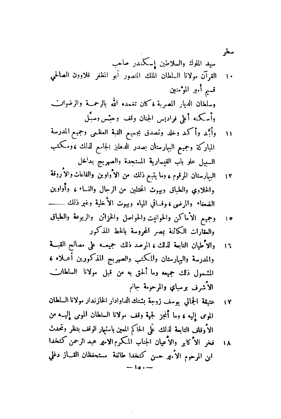 سيد الملوك والسلاطين إسكندر صاحب القرآن مولانا السلطان الملك المنصور أبو المظفر قلاوون الصالحي قسيم أمير المؤمنين وسلطان الديار المصرية، كان تغمده الله بالرحمة والرضوان وأسكنه أعلى فراديس الجنان وقف وحبس وسبل وأيد وأكد وخلد وتصدق بجميع القبة العظمى وجميع المدرسة المباركة وجميع البيمارستان بصدر الدهليز الجامع لذلك، ومكتب السبيل علو باب القيسارية المستجة والصهريج بدخل البيمارستان المرقوم، وما يتبع ذلك من الأواوين والقاعات والأروقة والخلاوي والطباق وبيوت المختلين من الرجال والنساء، وأواين الضعفاء والمرضى، وفساقي المياه وبيوت الأخلية وغير ذلك. . . . وجميع الأماكن والحوانيت والحواصل والخزائن والربوعة والطباق والعقارات الكائنة بمصر المحروسة بالخط المذكور والأطيان التابعة لذلك، المرصد ذلك جميعه على مصالح القبة والمدرسة والبيمارستان والمكتب والصهريج المذكورين أعلاه، المشمول ذلك جميعه وما ألحق به من قبل مولانا السلطان الأشرف برسباي والمرحومة جانم عتيقة الجمالي يوسف زوجة بشتك الداوادار الخازندار مولانا السلطان الموما إليه، وما أنجز لجهة وقف مولانا السلطان المومى إليه من الأوقاف التابعة لذلك على الحاكم المعين باستيمار الوقف بنظر وتحدث فخر الأكابر والأعيان الجناب المكرك الأمير عبد الرحمن كتخذا ابن المرحوم الأمير حسن كتخدا طائفة مستحفظان القاز دغلي