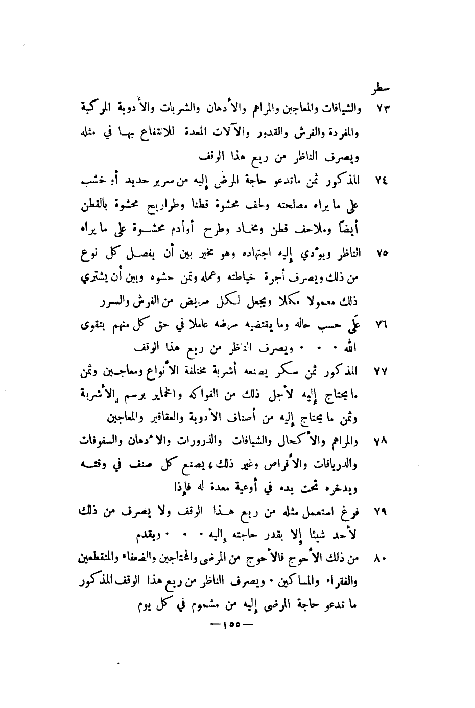 هذا الوقف المذكور ثمن ما تدعو حاجة المرضى إليه من سرير حديد أو خشب على ما يراه مصلحته ولحف محشوة قطنا وطراريح محشوة على ما يراه الناظر ويؤدي إليه اجتهاده وهو مخير بين أن يفصل كل نوع من ذلك ويصرف أجرة خياطته وعمله وثمن حشوه وبين أن يشتري ذلك معمولا مكملا ويجعل لكل مريض من الفرش والسرر على حسب حاله وما يقتضيه مرضه عاملا في حق كل منهم بتقوى الله. . . . . . . . . . . . . . . . ويصرف الناظر من ريع هذا الوقف المذكور ثمن سكر يصنعه أشربة مختلفة الأنواع ومعاجين وثمن ما يحتاج إليه لأجل ذلك من الفواكه والخماير برسم الأشربة وثمن ما يحتاج إليه من أصناف الأدوية والعقاقير والمعاجين والمراهم والأكحال والشيافات والذرورات والأدهان والسفوفات والدريافات والأقراص وغير ذلك، يصنع كل صنف في وقته ويدخره تحت يده في أوعية معدة له فإذا فرغ استعمل مثله من ريع هذا الوقف ولا يصرف من ذلك لأحد شيئا إلا بقدر حاجته إليه. . . . . . . . . . . ويقدم من ذلك الأحوج فالأحوج من المرضى والمحتاجين والضعفاء والمنقطعين والفقراء والمساكين. ويصرف الناظر من ريع هذا الوقف المذكور ما تدعوا حاجة المرضى إليه من مشموم في كل يوم