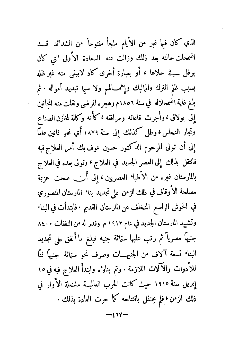الذي كان فيما غبر من الأيام ملجأ مفتوحا من الشدائد قد اضمحلت حالته بعد ذلك وزالت عنه السعادة الأولى التي كان يرفل في حلاها، أو بعبارة أخرى كاد لا يبقى منه غير ظله بسبب ظلم الترك والمماليك وإهمالهم ولا سيما تبديد أمواله. ثم بلغ غاية اضمحلاله في سنة 1856م وهجره المرضى ونقلت منه المجانين إلى يوم بولاق، وأجرت قاعاته ومرافقه، كأنه وكالة لمخازن الصناع وتجار النحاس، وظل كذلك إلى سنة 1879 أي نحو ثمانين عاما إلى أن تولى المرحوم الدكتور حسين عوف بك أمر العلاج فيه فانتقل بذلك إلى العصر الجديد في العلاج، وتولى بعده في العلاج بالمارستان وغيره من الأطباء العصريين، إلى أن صحت عزيمة مصلحة الأوقاف في ذلك الزمن على تجديد بناء المارستان المنصوري في الحوش الواسع المتخلف عن المارستان القديم. فابتدأت في البناء وتشييد المارستان الجديد في عام 1912م وقدر له من النفقات 8400 جنيها مصريا ثم رتب عليها ستمائة جنيه فبلغ ما أنفق على تجديد البناء تسعة آلاف من الجنيهات وصرف نحو ستمائة جنيها ثمنا للأدوات والآلات اللازمة. وتم بناءه وأبتدأ العلاج فيه في 15 إبريل سنة 1915 حيث كانت الحرب العالمية مشتعلة الأوار في ذلك الزمن، فلم يحتفل بافتتاحه كما جرت العادة بذلك.