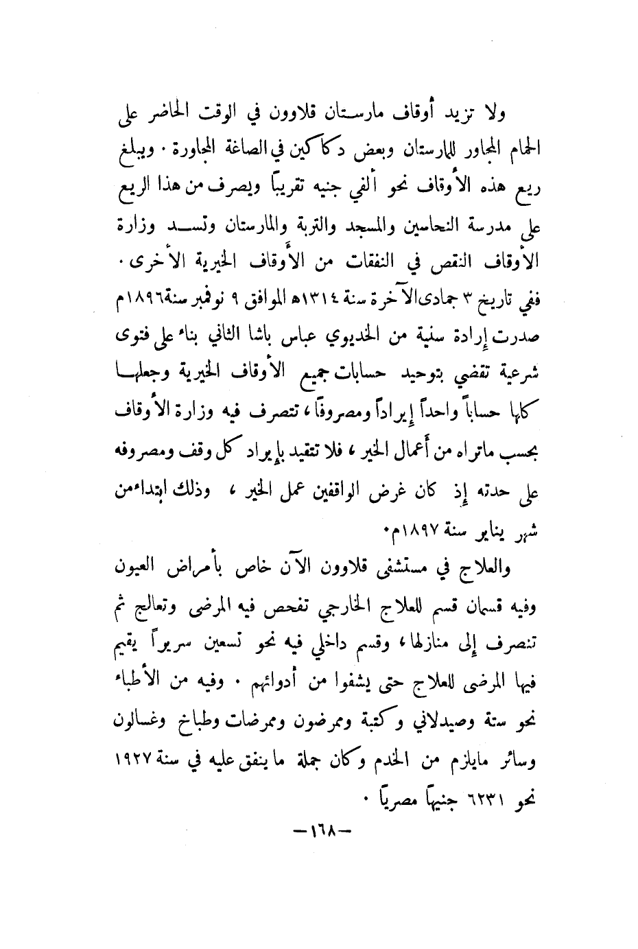 والمارستان وتسد وزارة الأوقاف النقص في النفقات من الأوقاف الخيرية الأخرى. ففي تأريخ 3 جمادى الآخر سنة 1314هـ الموافق 9 نوفمبر سنة 1896م صدرت إرادة سنية من الخديدوي عباس باشا الثاني بناء على فتوى شرعية تقضي بتوحيد حسابات جميع الأوقاف الخيرية وجعلها كلها حسابا واحدا إيرادا ومصروفا، تتصرف فيه وزارة الأوقاف بحسب ما تراه من أعمال الخير، فلا تتقيد بإيراد كل وقف ومصروفه على حدته إذ كان غرض الواقفين عمل الخير، وذلك ابتداء من شهر يناير سنة 1897م.