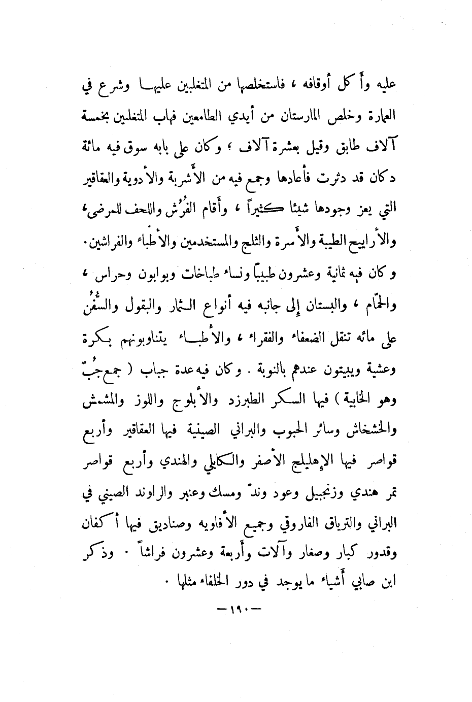 عليه وأكل أوقافه، فاستخلصها من المتغلبين عليها وشرع في العمارة وخلص المارستان من أيدي الطامعين فهاب المتغلبين بخمسة آلف طابق وقيل بعشرة آلاف، وكان على بابه سوق فيه مائة دكان قد دثرت فأعادها وجمع فيه من الأشربة والأدوية والعقاقير التي يعز وجودها شيئا كثيرا، وأقام الفرش واللحف للمرضى، والأراييح الطيبة والأسرة والثلج والمستخدمين والأطباء والفراشين. وكان فيه ثمانية وعشرون طبيبا ونساء طباخات وبوابون وحراس، والحمام، والبستان إلى جانبه فيه أنواع الثمار والبقول والسفن على مائة تنقل الضعفاء والفقراء، والأطباء يتناوبونهم بكرة وعشية ويبيتون عندهم بالنوبة. وكان فيه عدة جباب جمع جب وهو الخابية فيها السكر الطبرزد والأبلوج واللوز والمشمش والخشخاش وسائر