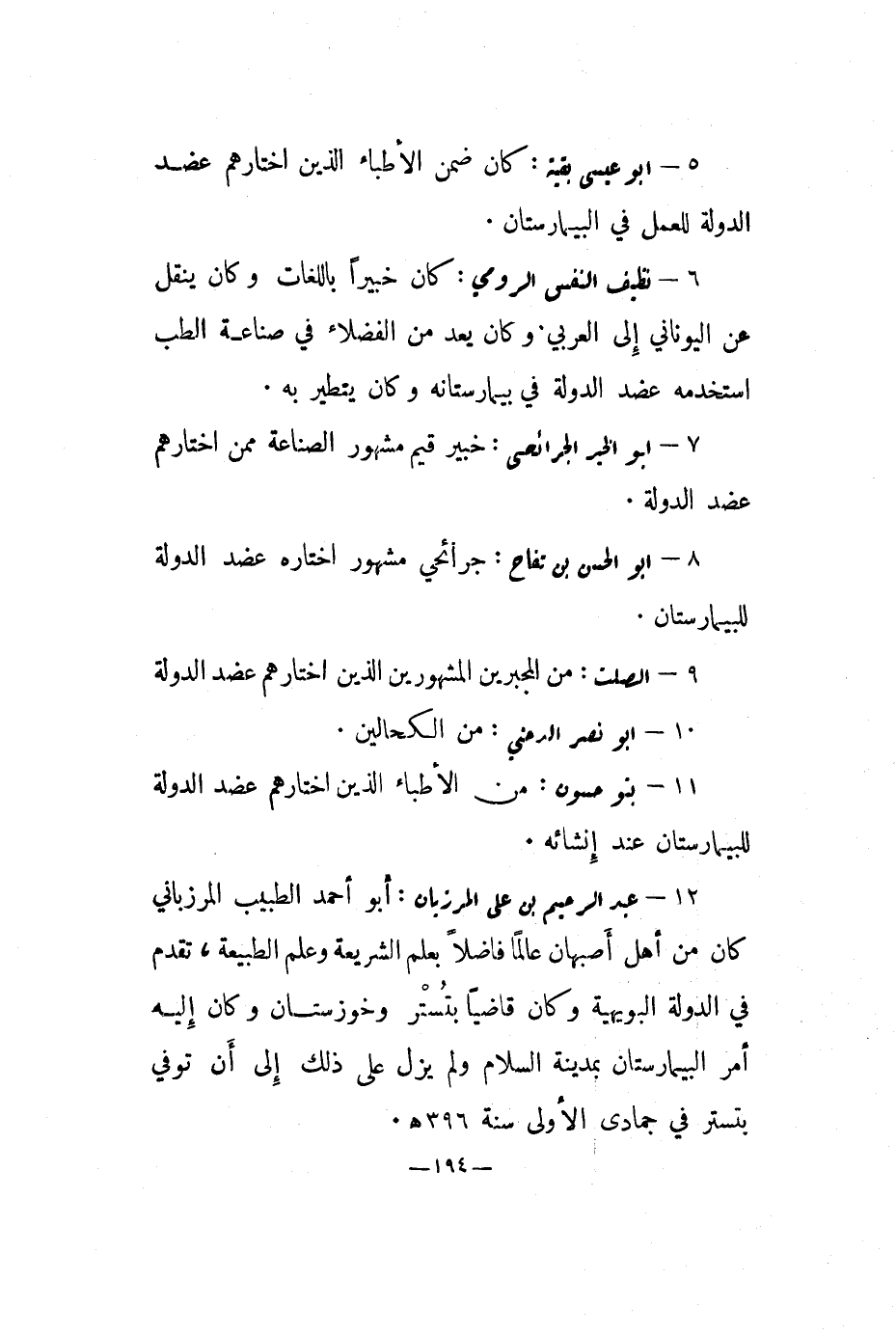 5 - أبو عيسى بقية: كان ضمن الأطباء الذين أختارهم عضد الدولة للعمل في البيمارستان.