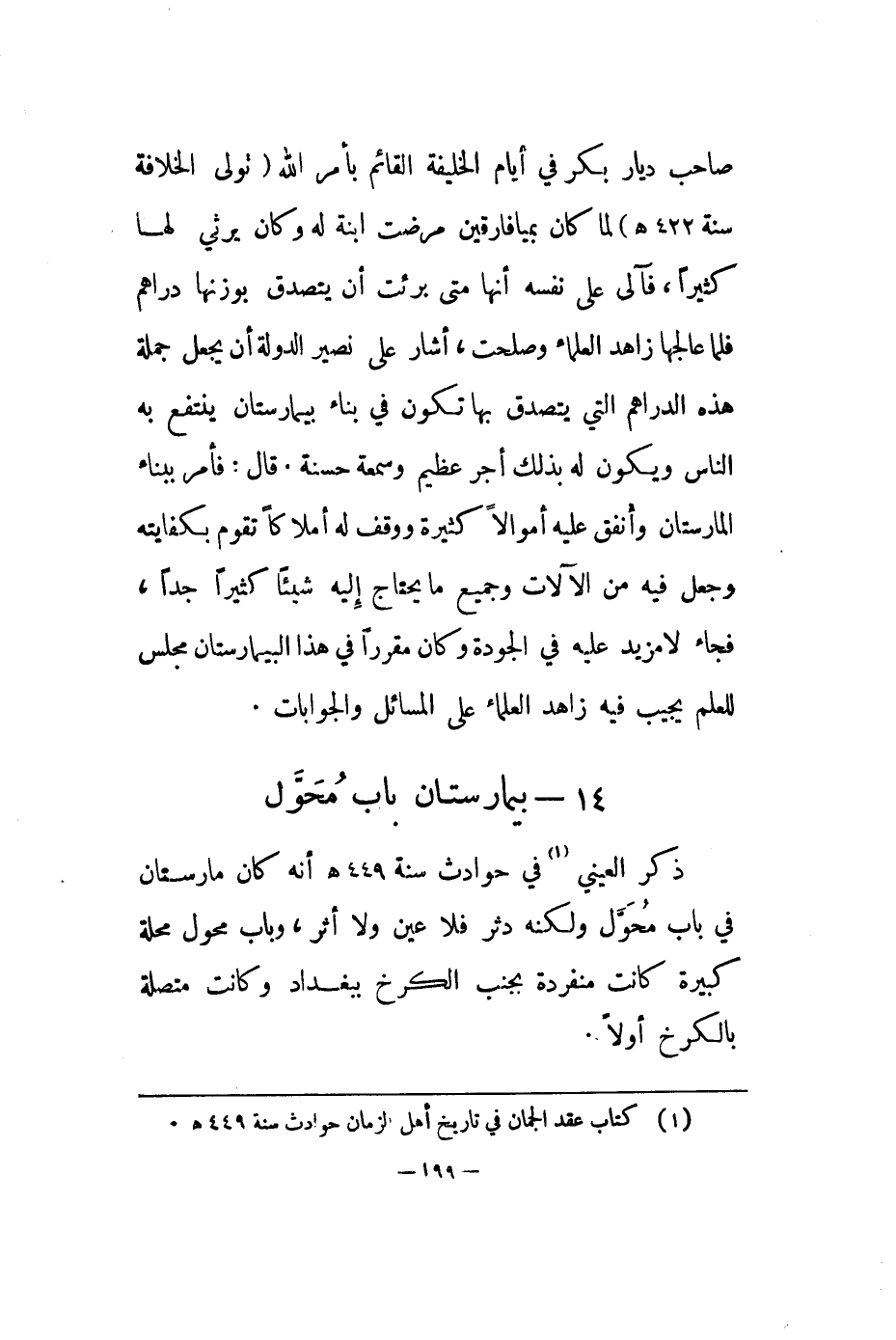 الخلافة سنة 422هـ لما كان بميافارقين مرضت ابنة له وكان يرثي لها كثيرا، فآلى على نفسه أنها متى برئت أن يتصدق بوزنها دراهم فما عالجها زاهد العلماء وصلحت، أشار على نصير الدولة أن يجعل جملة هذه الدراهم التي يتصدق بها تكون في بناء بيمارستان ينتفع به الناس ويكون له بذلك أجر عظيم وسمعة حسنة. قال: فأمر ببناء المارستان وأنفق عليه أموالا كثيرة ووقف له أملاكا تقوم بكفايته وجعل فيه من الآلات وجميع ما يحتاج إليه شيئا كثيرا جدا، فجاء لا مزيد عليه في الجودة وكان مقررا في هذا البيمارستان مجلس للعلم يجيب فيه زاهد العلماء على المسائل والجوابات.