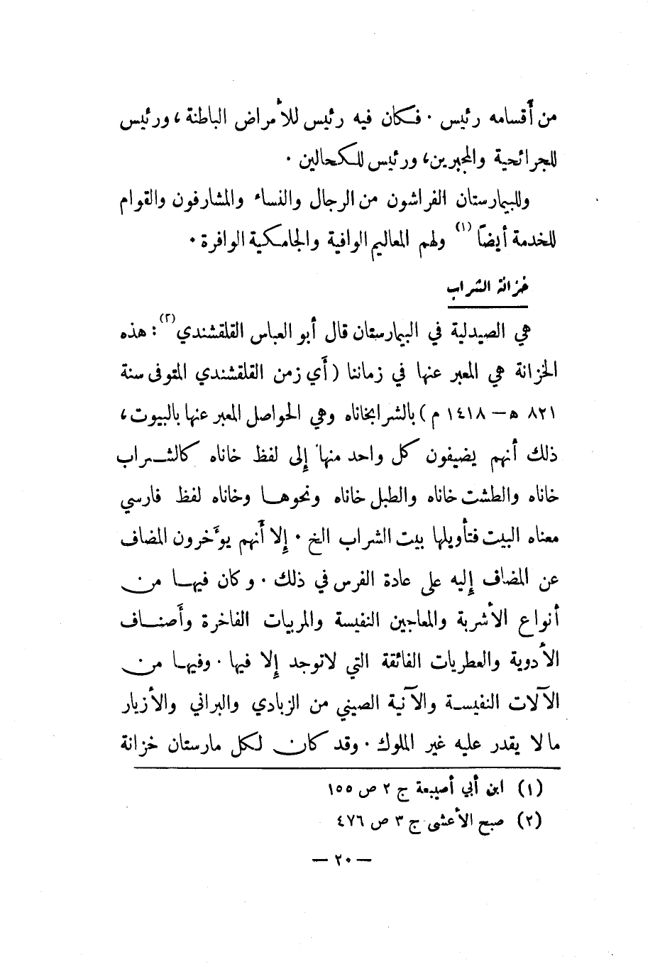 هي الصيدلية في البيمارستان قال أبو العباس القلقشندي: هذه الخزانة هي المعبر عنها في زماننا أي زمن القلقشندي المتوفى سنة 821هـ - 1418م بالشرابخاناه وهي الحواصل المعبر عنها بالبيوت، ذلك أنهم يضيفون كل واحد منها إلى لفظ خاناه كالشراب خاناه والطشت خاناه والطبل خاناه ونحوها وخاناه لفظ فارسي معناه البيت فتأويلها بيت الشراب الخ. إلا أنهم يؤخرون المضاف عن المضاف إليه على عادة الفرس في ذلك. وكان فيها من أنواع الأشربة والمعاجين النفيسة والمربيات الفاخرة وأصناف الأدوية والعطريات الفائقة التي ر توجد إلا فيها. وفيها من الآلات النفيسة والآنية الصيني من الزبادي والبراني والأزبار ما لا يقدر عليه غير الملوك. وقد كان لكل مارستان خزانة