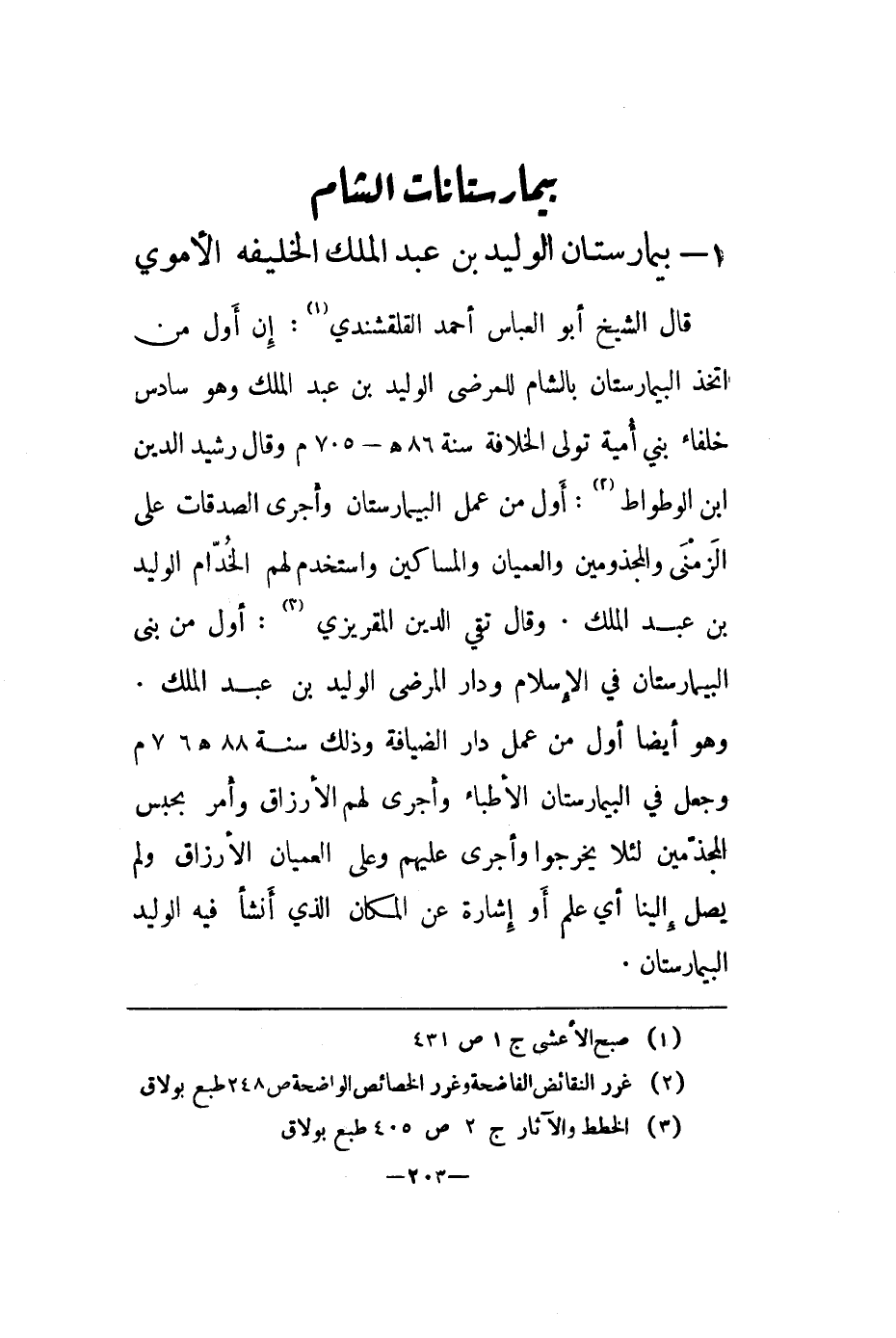 قال الشيخ أبو العباس أحمد الفلقشندي: إن أول من اتخذ البيمارستان بالشام للمرضى الوليد بن عبد الملك وهو سادس خلفاء بني أمية تولى الخلافة سنة 86هـ - 705م وقال رشيد الدين ابن الوطواط: أول من عمل البيمارستان وأجرى الصدقات على الزمنى والمجذومين والعميان والمساكين واستخدم لهم الخدّام الوليد بن عبد الملك. وقال تقي الدين المقريزي: أول من بنى البيمارستان في الإسلام ودار المرضى الوليد بن عبد الملك. وهو أيضا أول من عمل دار الضيافة وذلك سنة 88هـ 706م وجعل في البيمارستان الأطباء وأجرى لهم الأرزاق وأمر بحبس المجذمين لئلا يخرجوا وأجرى عليهم وعلى العميان الأرزاق ولم يصل إلينا أي علم أو إشارة عن المكان الذي أنشأ فيه الوليد البيمارستان.