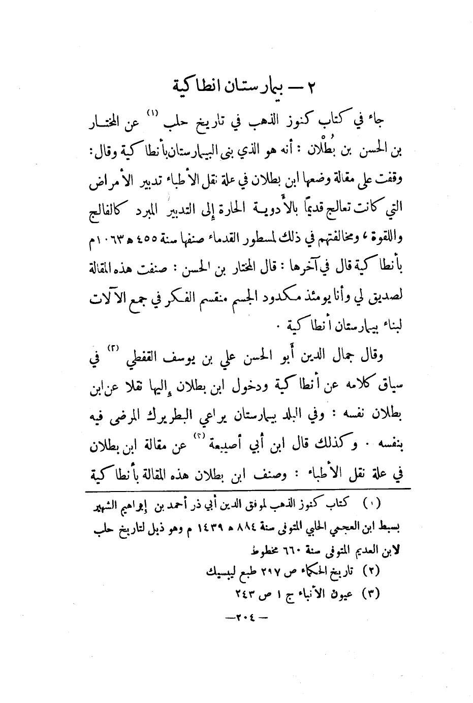 وقال جمال الدين أبو الحسن علي بن يوسف القفطي في سياق كلامه عن إنطاكية ودخول ابن بطلان إليها نقلا عن ابن بطلان نفسه: وفي البلد بيمارستان يراعي البطريرك المرضى فيه بنفسه. وكذلك قال ابن أبي أصيبعة عن مقالة ابن بطلان