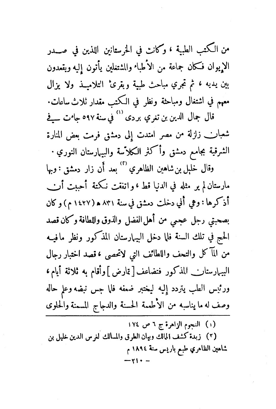 وقال خليل بن شاهين الظاهري بعد أن زار دمشق: وبها مارستان لم ير مثله في الدنسا قط، واتفقت نكتة أحببت أن أذكرها: وهي أني دخلت دمشق في سنة 831هـ 1427م وكان بصحبتي رجل عجمي من أهل الفضل والذوق واللطافة وكان قصد الحج في تلك السنة فلما دخل البيمارستان المذكور ونظر ما فيه من المآكل والتحف واللطائف التي لا تحصى، قصد اختبار رجال البيمارستان المذكور فتضاعف تمارض وأقام به ثلاثة أيام، ورئيس الطب يتردد إليه ليختبر ضعفه فلما جس نبضه وعلم حاله وصف له ما يناسبه من الأطعمة الحسنة والدجاج المسمنة والحلوى