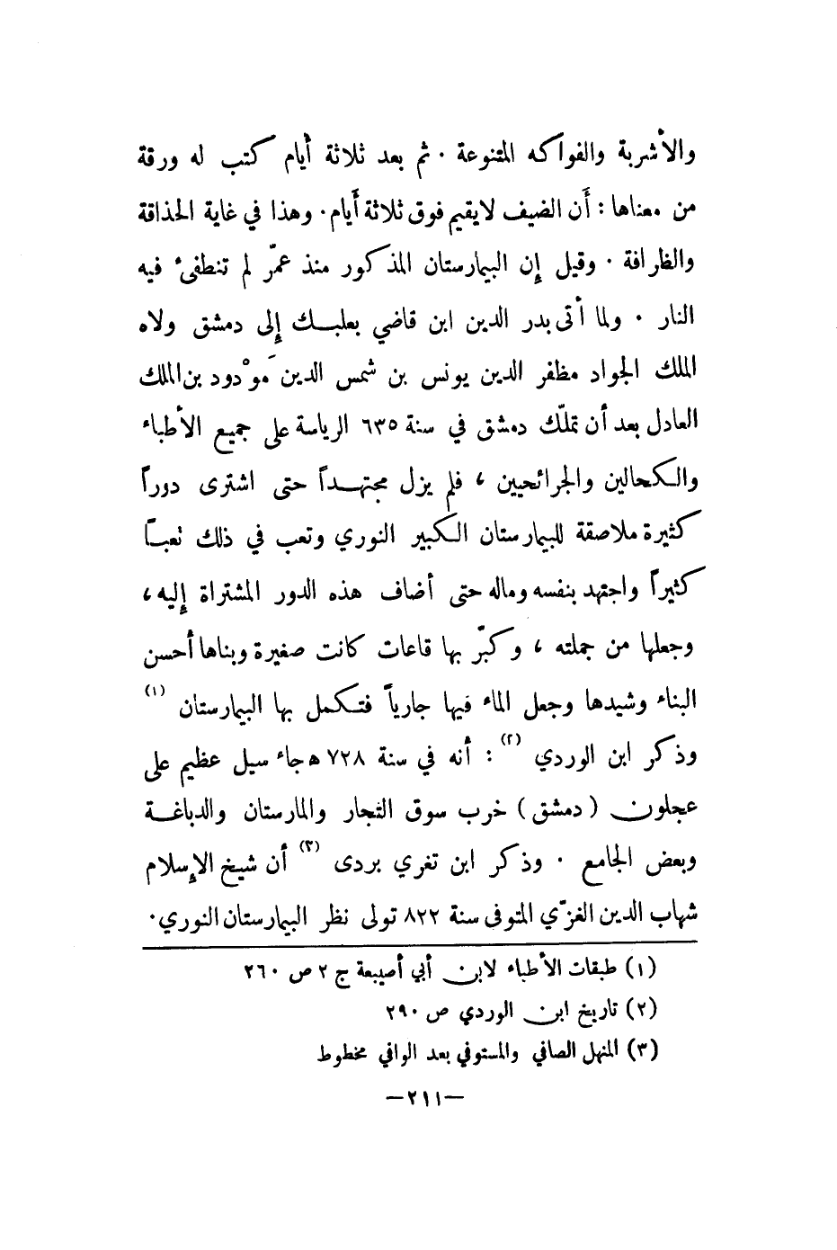 والأشربة والفواكه المتنوعة. ثم بعد ثلاثة أيام كتب له ورقة من معناها: أن الضعيف لا يقيم فوق ثلاثة أيام. وهذا في غاية الحذاقة والظرافة. وقيل إن البيمارستان المذكور منذ عمر لم تنطفئ فيه النار. ولما أتى بدر الدين ابن قاضي بعلبك إلى دمشق ولاه الملك الجواد مظفر الدين يونس بن شمس الدين مودود بن الملك العادل بعد أن تملك دمشق في سنة 635 الرياسة على جميع الأطباء والكحالين والجرائحيين، فلم يزل مجتهدا حتى اشترى دورا كثيرة ملاصقة للبيمارستان الكبير النوري وتعب في ذلك تعبا كثيرا واجتهد بنفسه وماله حتى