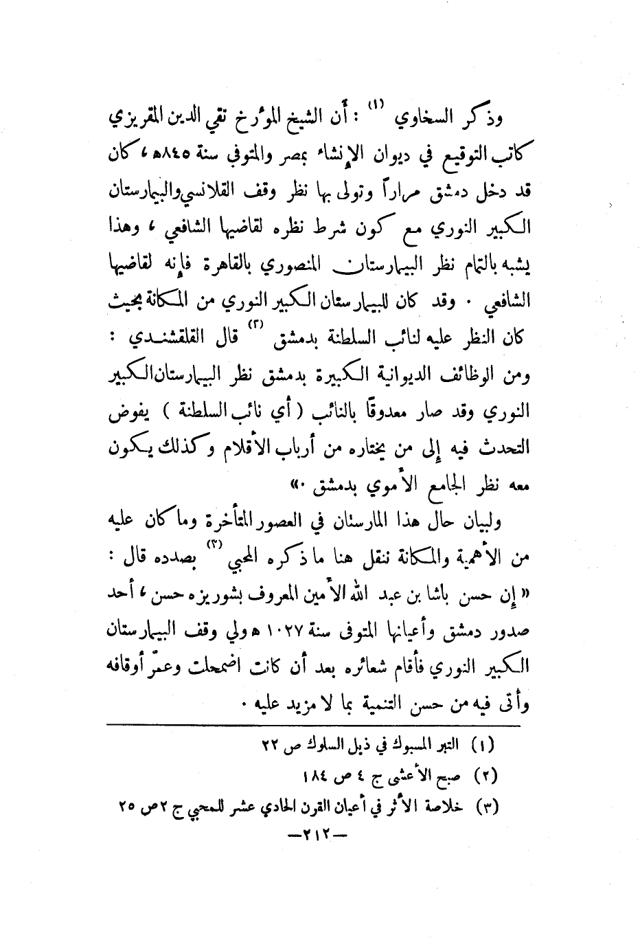 وذكر السخاوي: أن الشيخ المؤرخ تقي الدين المقريزي كاتب التوقيع في ديوان الإنشاء بمصر والمتوفى سنة 845هـ، كان قد دخل دمشق مرارا وتولى بها نظر وقف القلانسي والبيمارستان الكبير النوري مع كون شرط نظره لقاضيها الشافعي، وهذا يشبه بالتمام نظر البيمارستان المنصوري بالقاهرة فإنه لقاضيها الشافعي. وقد كان البيمارستان الكبير النوري من المكانة بحيث كان النظر عليه لنائب السلطنة بدمشق قال القلقشندي: ومن الوظائف الديوانية الكبيرة بدمشق نظر البيمارستان الكبير النوري وقد صار معدوقا بالنائب أي نائب السلطنة يفوض التحدث فيه إلى من يختاره من أرباب الأقلام وكذلك يكون معه نظر الجامع الأموي بدمشق.