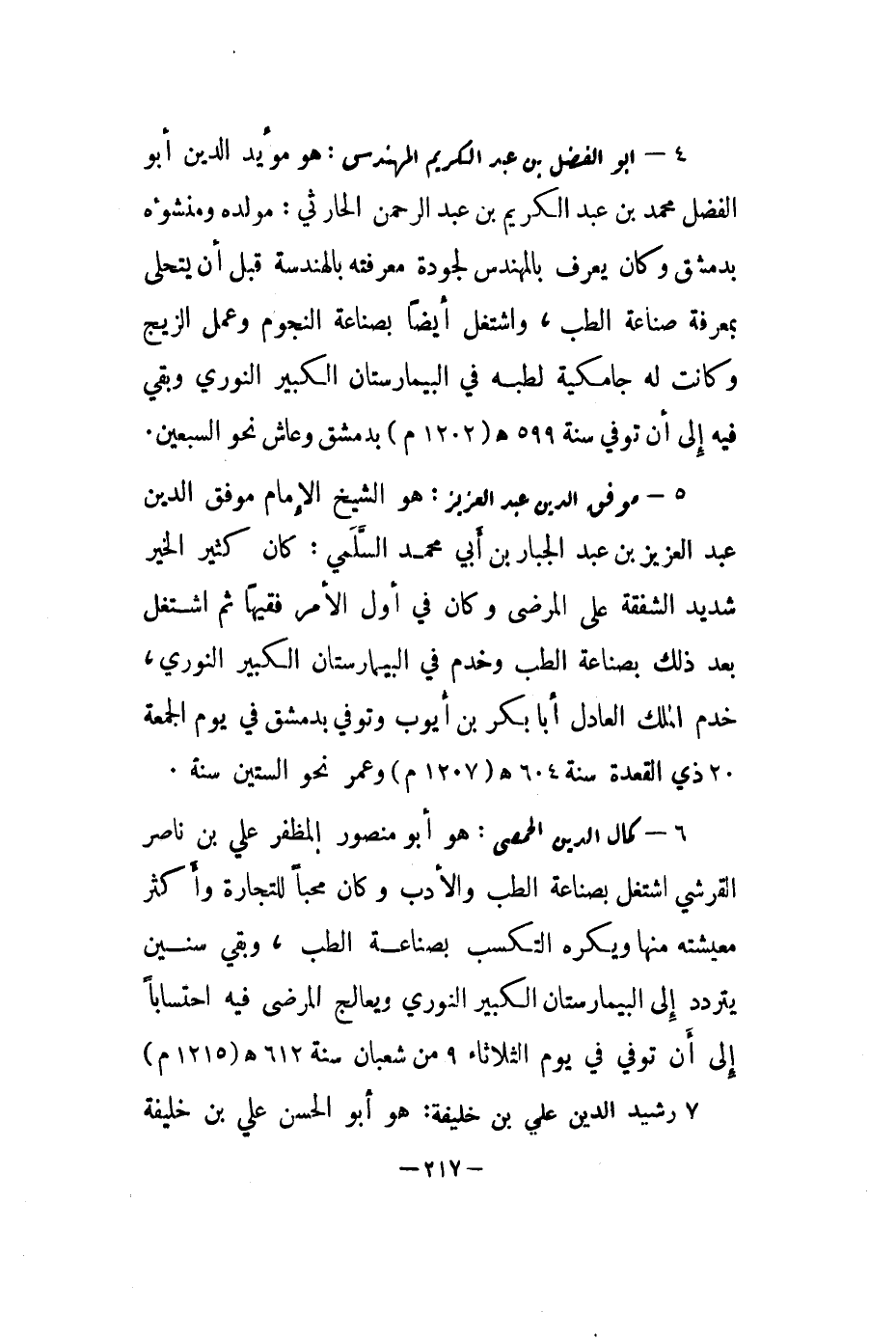 4 - أبو الفضل بن عبد الكريم المهندس: هو مؤيد الدين أبو الفضل محمد بن عبد الكريم بن عبد الرحمن الحارثي: مولده ومنشؤه بدمشق وكان يعرف بالمهندس لجودة معرفته بالهندسة قبل أن يتحلى بمعرفة صناعة الطب، واشتغل أيضا بصناعة النجوم وعمل الزيج وكانت له جامكية لطبه في البيمارستان الكبير