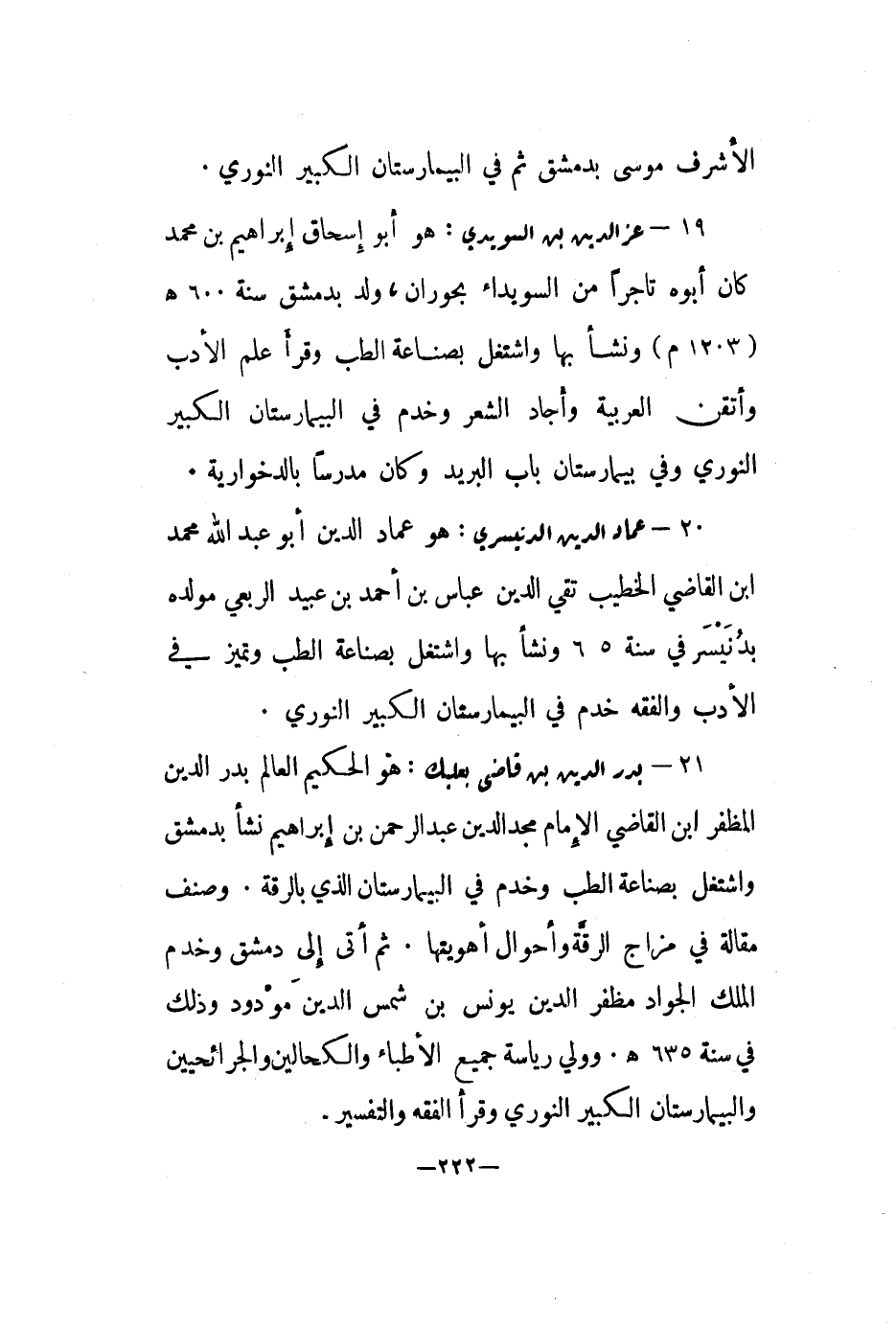 19 - عز الدين بن السويدي: هو أبو إسحاق إبراهيم بن محمد كان أبوه تاجرا من السويداء بحوران، ولد بدمشق سنة 600هـ 1203م ونشأ بها واشتغل بصناعة الطب وقرأ علم الأدب وأتقن العربية وأجاد الشعر وخدم في البيمارستان الكبير النوري وفي بيمارستان باب البريد وكان مدرسا بالدخوارية.
