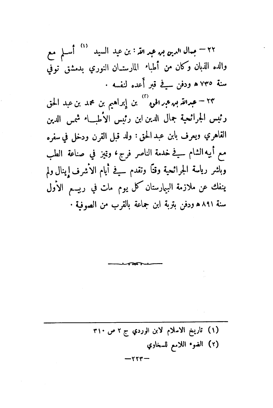 23 - عبد الله بن عبد الحق: بن إبراهيم بن محمد بن عبد الحق رئيس الجرائحية جمال الدين ابن رئيس الأطباء شمس الدين القاهري ويعرف بابن عبد الحق: ولد قبل القرن ودخل في سفره مع أبيه الشام في خدمة الناصر فرج، وتميز في صناعة الطب وباشر رياسة الجرائحية وقتا وتقدم في أيام الأشرف إينال ولم ينفك عن ملازمة البيمارستان كل يوم مات في ربيع الأول سنة 891هـ ودفن بتربة ابن جماعة بالقرب من الصوفية.