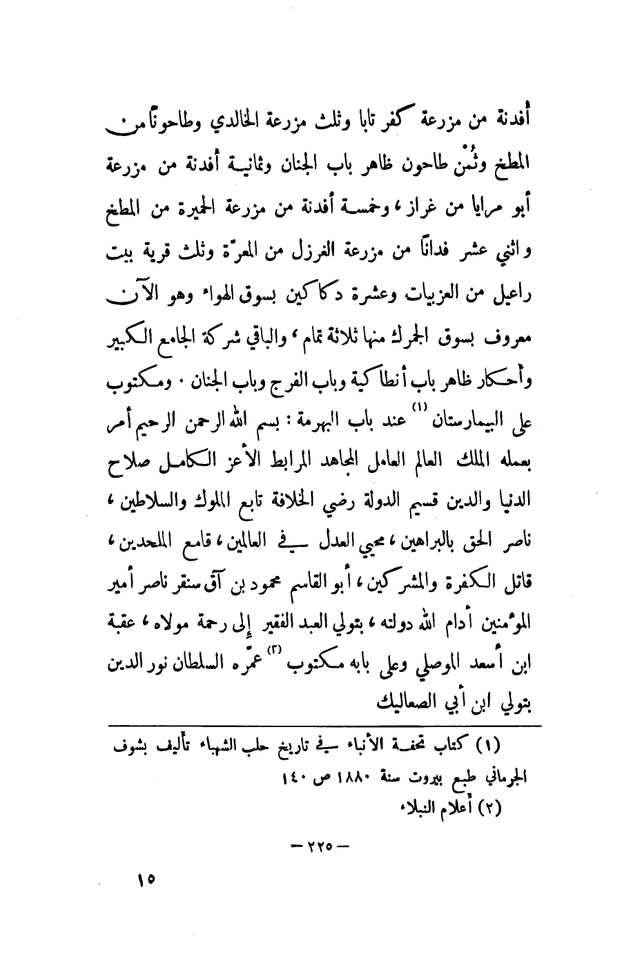 أفدنة من مزرعة كفر تابا وثلت مزرعة الخالدي وطاحونا من المطخ وثمن طاحون ظاهر باب الجنان وثمانية أفدنة من مزرعة أبو مرايا من غراز، زخمسة أفدنة من مزرعة الحميرة من المطخ واثني عشر فدانا من مزرعة الغرزل من المعرّة وثلث قرية بيت راعيل من العزبيات وعشرة دكاكين بسوق الهواء وهو الآن معروف بسوق الجمرك منها ثلاثة تمام، والباقي شركة الجامع الكبير وأحكار ظاهر باب إنطاكية وباب الفرج وباب الجنان. ومكتوب على البيمارستان عند باب البهرمة: بسم الله الرحمن الرحيم أمر بعمله الملك العالم العامل المجاهد المرابط الأعز الكامل صلاح الدنيا والدين قسيم الدولة رضي الخلافة تابع الملوك والسلاطين،