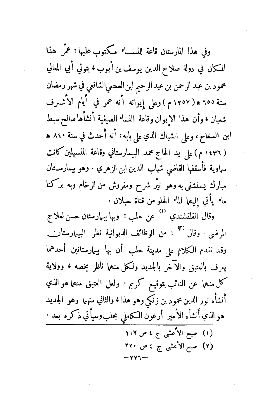 وقال الفلقشندي عن حلب: وبها بيمارستان حسن لعلاج المرضى. وقال: من الوظائف الديوانية نظر البيمارستان وقد تقدم الكلام على مدينة حلب أن بها بيمارستان أحدهما يعرف بالعتيق والآخر بالجديد ولكل منهما ناظر يخصه، وولاية كل منهما عن النائب بتوقيع كريم. ولعل العتيق منهما هو الذي أنشأه نور الدين محمود بن زنكي وهو هذا، والثاني منهما وهو الجديد هو الذي أنشأه الأمير أرغون الكاملي بحلب وسيأتي ذكره بعد.