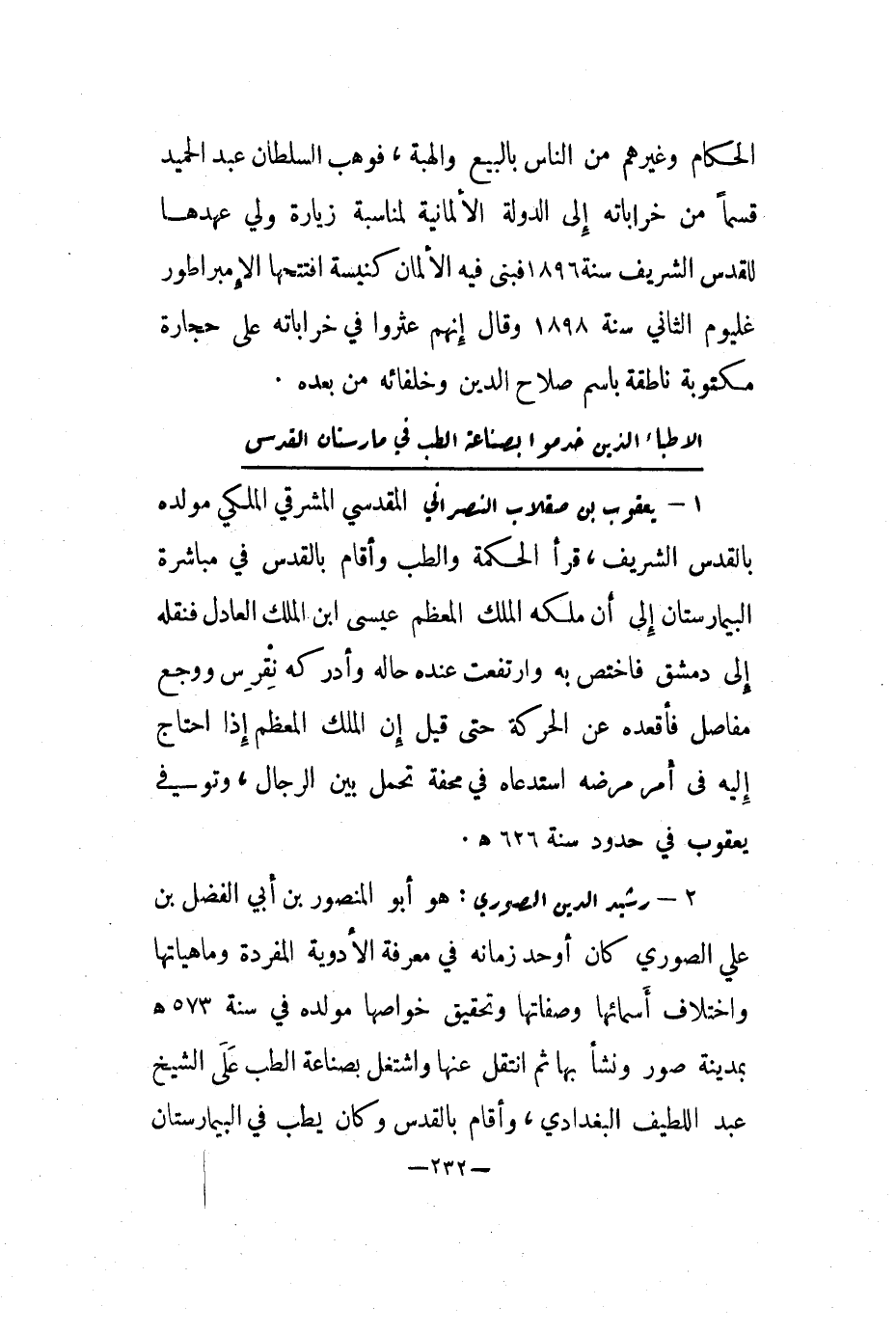 2 - رشيد الدين الصوري: هو أبو المنصور بن أبي الفضل بن علي الصوري كان أوحد زمانه في معرفة الأدوية المفردة وماهياتها واختلاف أسمائها وصفاتها وتحقيق خواصها مولده في سنة 573هـ بمدينة صور ونشأ بها ثم انتقل عنها واشتغل بصناعة الطب على الشيخ عبد اللطيف البغدادي، وأقام بالقدس وكان