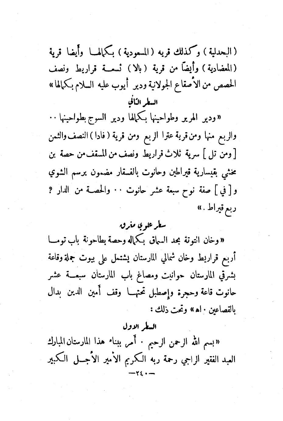 دير الهرير وطواحينها بكمالها ودير السوج بطواحينها. . والربع منها ومن قرية عترا الربع ومن قرية فادا النصف والثمن من تل سرية ثلاث قراريط ونصف من المسقف من حصة بن مخشي بقيسارية قيراطين بالفسقار مضمون برسم الشوي وفي صفة نوح سبعة عشر حانوت. . والحصة من الدار؟ ربع قيراط.