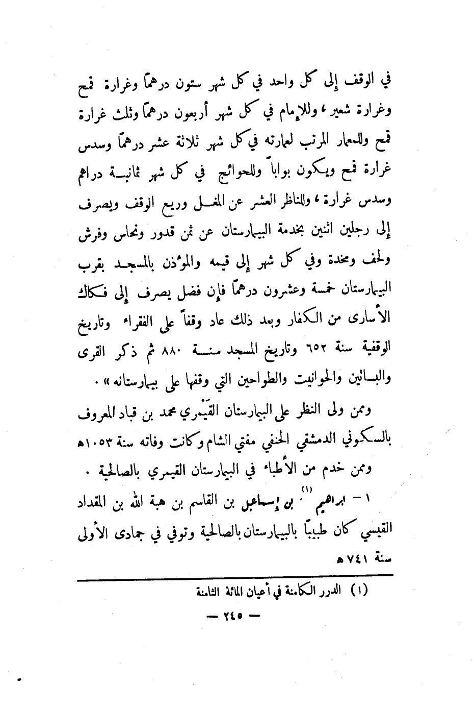 البيمارستان عن ثمن قدور ونحاس وفرش ولحف ومخدة وفي كل شهر إلى قيمه والمؤذن بالمسجد بقرب البيمارستان خمسة وعشرون درهما فإن فضل يصرف إلى فكاك الأسارى من الكفار وبعد ذلك عاد فضل يصرف إلى فكاك الأسارى من الكفار وبعد ذلك عاد وقفا على الفقراء وتاريخ الوقفية سنة 652 وتاريخ المسجد سنة 880 ثم ذكر القرى والبساتين والحوانيت والطواحين التي وقفها على بيمارستانه.