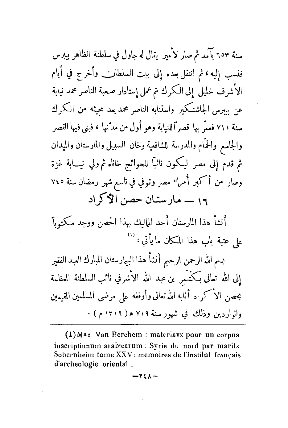 بسم الله الرحمن الرحيم أنشأ هذا البيمارستان المبارك العبد الفقير إلى الله تعالى بكتمر بن عبد الله الأشرفي نائب السلطنة المعظمة بحصن الأكراد أنابه الله تعالى وأوقفه على مرضى المسلمين المقيمين والوردين وذلك في شهور سنة 719هـ 1319م.