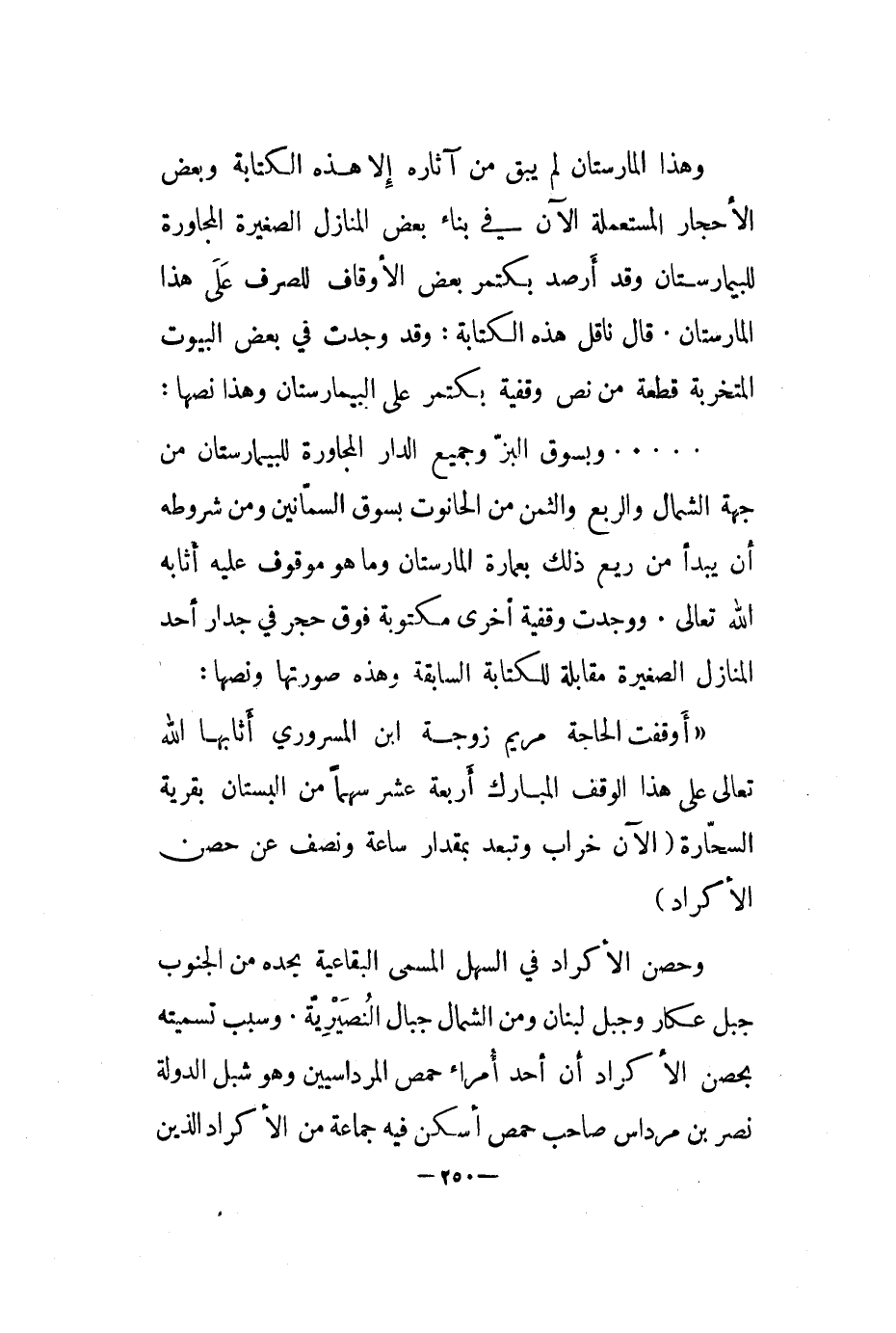 . . . وبسوق البزّ وجميع الدار المجاورة للبيمارستان من جهة الشمال والربع والثمن من الحانوت وبسوق السمانين ومن شروطه أن يبدأ من ريع ذلك بعمارة المارستان وما هو موقوف عليه أثابه الله تعالى. ووجدت وقفية أخرى مكتوبة فوق حجر في جدار أحد المنازل الصغيرة مقابلة للكتابة السابقة وهذه صورتها ونصها: