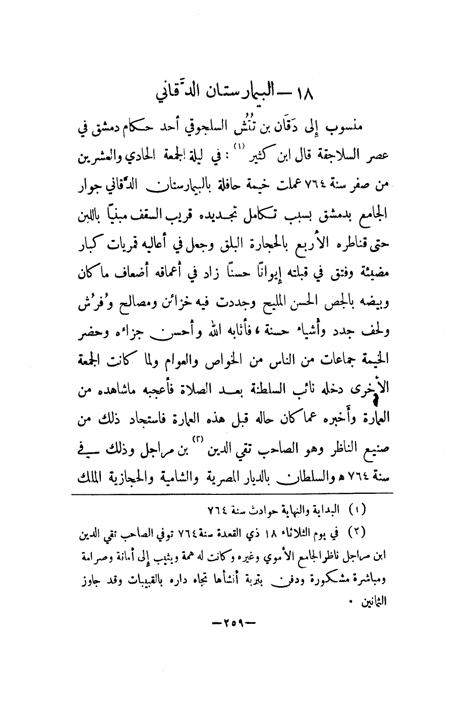 منسوب إلى دقان بن تتش السلجوقي أحد حكام دمشق في عصر السلاجقة قال ابن كثير: في ليلة الجمعة الحادي والعشرين من صفر سنة 764 عملت خيمة حافلة بالبيمارستان الدَّقاني جوار الجامع بدمشق بسبب تكامل تجديده قريب السقف مبنيا باللبن حتى قناطره الأربع بالحجارة البلق وجعل في أعاليه قمريات كبار مضيئة وفتق في قبلته إيوانا حسنا زاد في أعماقه أضعاف ما كان وبيضه بالجض الحسن المليح وجددت فيه خزائن ومصالح وفرش ولحف جدد وأشياء حسنة، فأثابه الله وأحسن جزاءه وحضر الخيمة جماعات من الناس من الخواص والعوام ولما كانت الجمعة الأخرى دخله نائب السلطنة بعد الصلاة فأعجبه ما شاهده من العمارة وأخبره عما كان حاله قبل هذه العمارة فاستجاد ذلك من صنيع الناظر وهو الصاحب تقي الدين بن مراجل وذلك في سنة 764هـ والسلطان بالديار المصرية والشامية والحجازية الملك