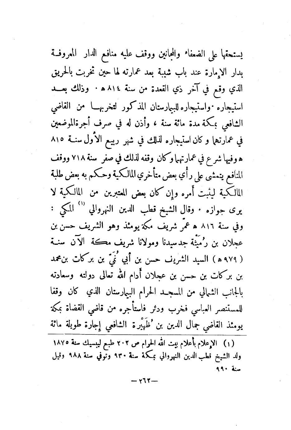 يستحقها من الضعفاء والمجانين ووقف عليه منافع الدار المعروفة بدار الإمارة عند باب شيبة بعد عمارته لها حين تخربت بالحريق الذي وقع في آخر ذي القعدة من سنة 814هـ. وذلك بعد استيجاره. واستيجاره للبيمارستان، وأذن له في صرف أجرة الموضعين في عمارتهما وكان استيجاره لذلك في شهر ربيع الأول سنة 815 هو فيها شرع في عمارتهما وكان وقفه لذلك في صفر سنة 718 ووقف المنافع يتمشى على رأي بعض متأخري المالكية وحكم به بعض طلبة المالكية ليثبت أمره وإن كان بعض المعتبرين من المالكية لا يرى جوازه. وقال الشيخ قطب الدين النهروالي المكي: وفي سنة 816هـ عمر شريف مكة يومئذ وهو الشريف حسن بن عجلان بن رميثة جد سيدنا ومولانا شريف مكة الآن سنة 979هـ السيد الشريف حسن بن أبي نمي بن بركات بن محمد بن بركات بن حسن بن عجلان أدام الله تعالى دولته وسعادته