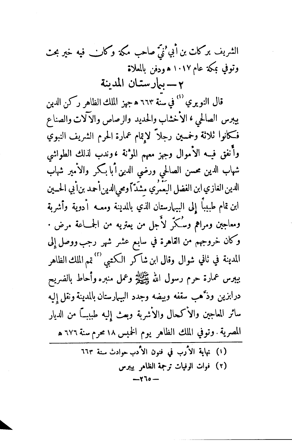 قال النويري في سنة 663هـ جهز الملك الظاهر ركن الدين بيبرس الصالحي، الأخشاب والحديد والرصاص والآلات والصناع فكانوا ثلاثة وخمسين رجلا لإتمام عمارة الحرم الشريف النبوي وأنفق فيه الأموال وجهز معهم المؤنة، وندب لذلك الطواشي شهاب الدين محسن الصالحي ورضي الدين أبا بكر والأمير شهاب الدين الغازي ابن الفضل اليعمري مشدّا ومحي الدين أحمد بن أبي الحسين ابن تمام طبيبا إلى البيمارستان الذي بالمدينة ومعه أدوية وأشربة ومعاجين ومراهم وسكر لأجل من يعتريه من الجماعة مرض. وكان خروجهم من القاهرة في سابع عشر شهر رجب ووصل إلى المدينة في ثاني شوال وقال ابن شاكر الكتبي تمم الملك الظاهر بيبرس عمارة حرم رسول اله صلى الله عليه وسلم وعمل منبره وأحاط بالضريح درابزين وذّضهب سقفه وبيضه وجدد البيمارستان بالمدينة ونقل إليه سائر المعاجين والأكحال والأشربة وبعث إليه طبيبا من الديار المصرية. وتوفي
